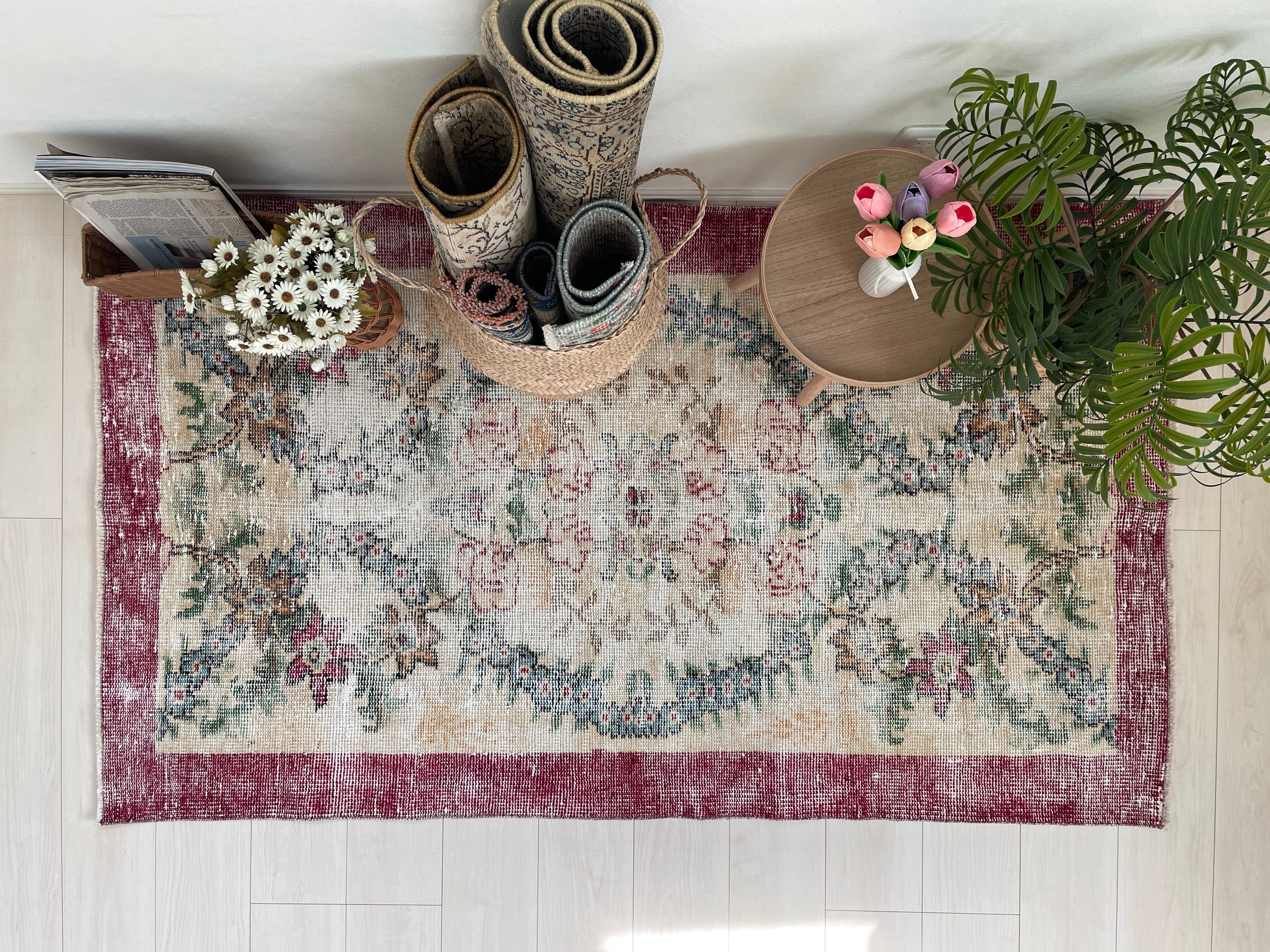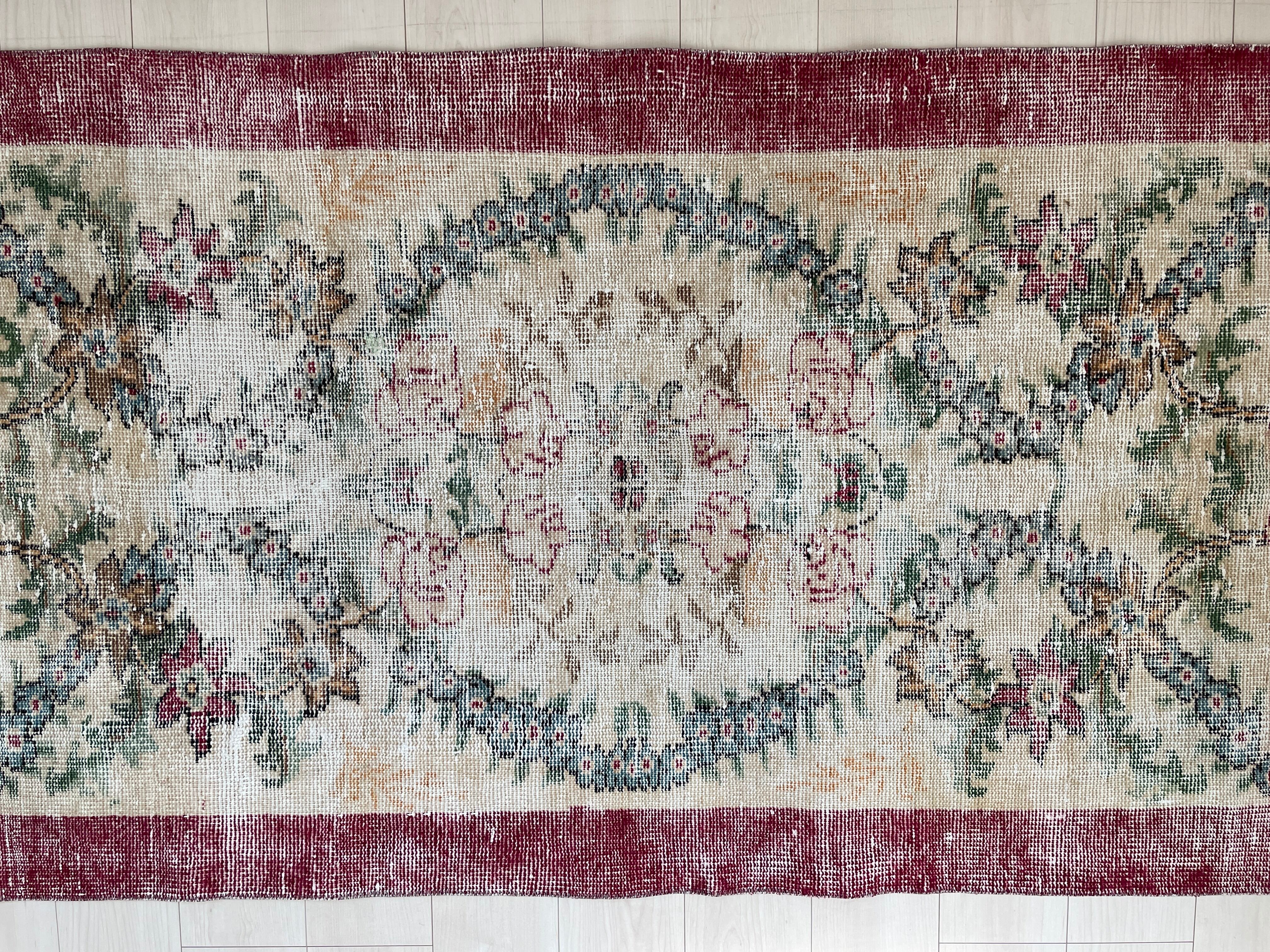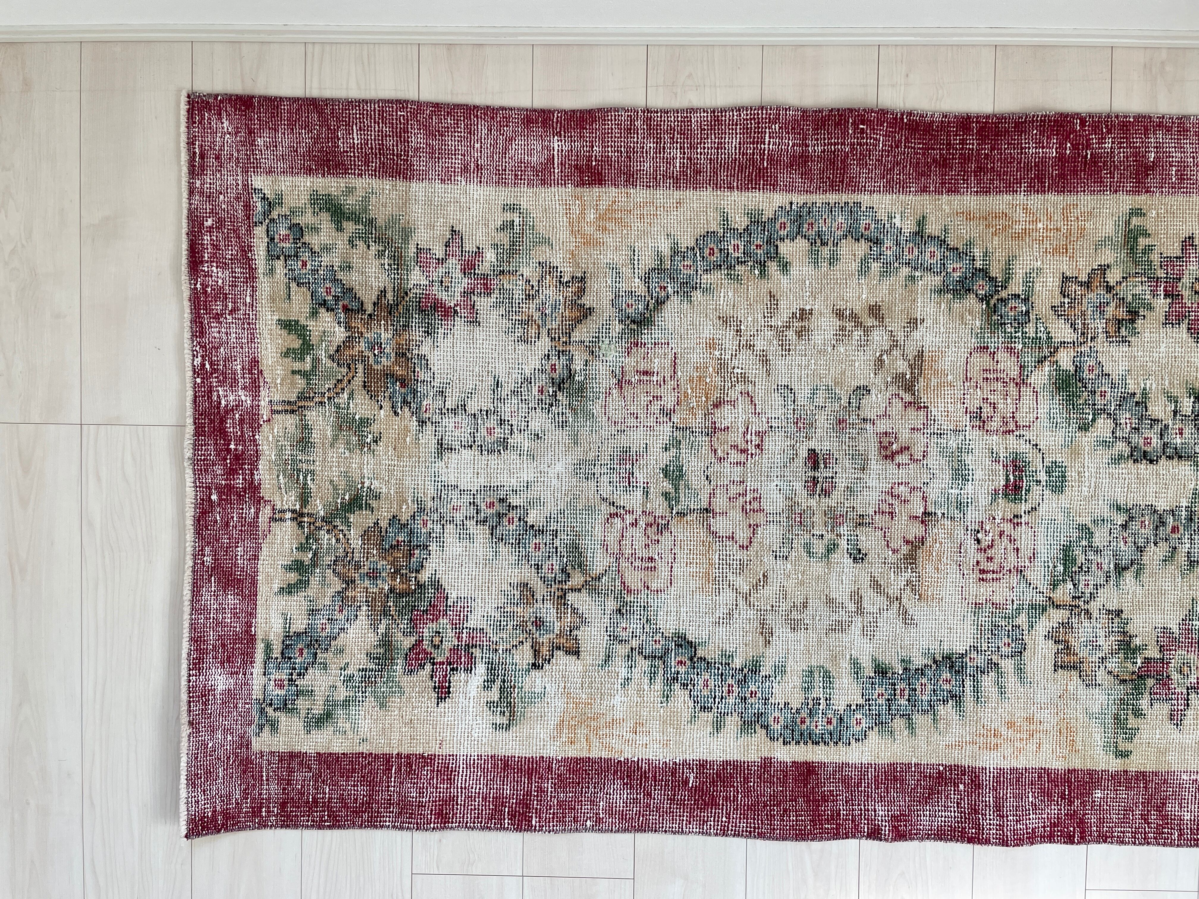 平和の象徴のようなお花が連なったデザインが魅力的なヴィンテージラグ。