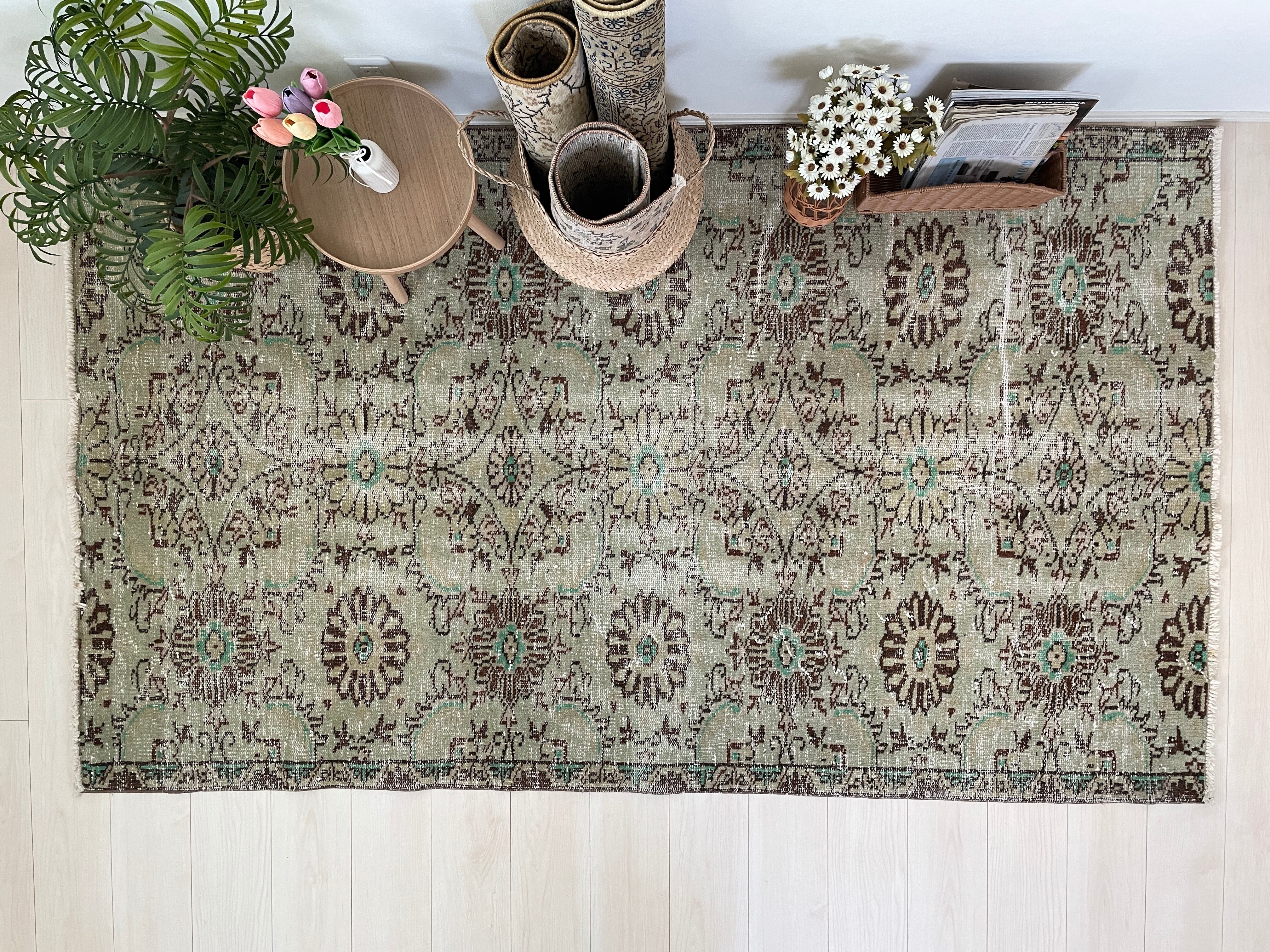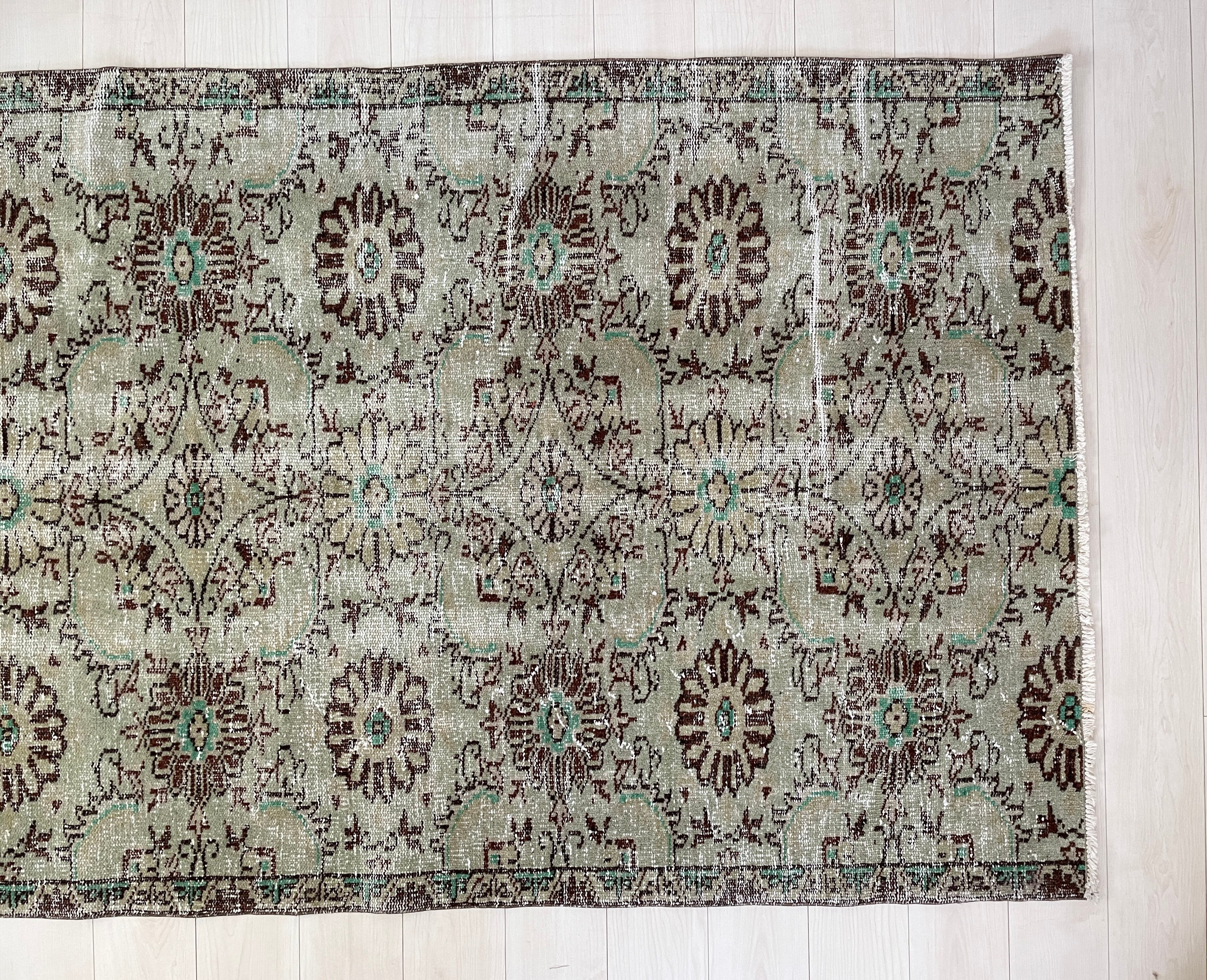 優しいグリーンとブラウンの組み合わせに癒されるヴィンテージラグ。