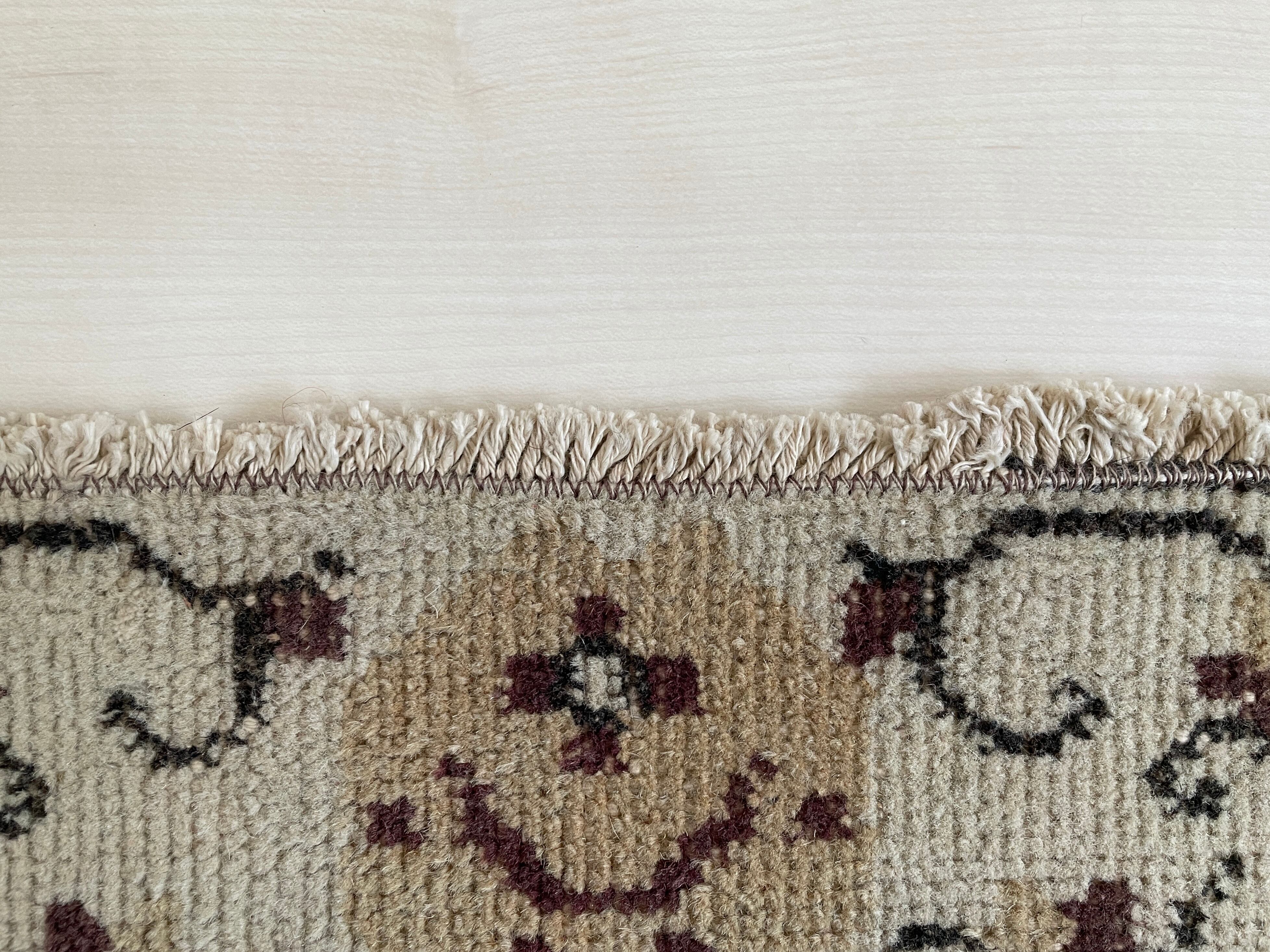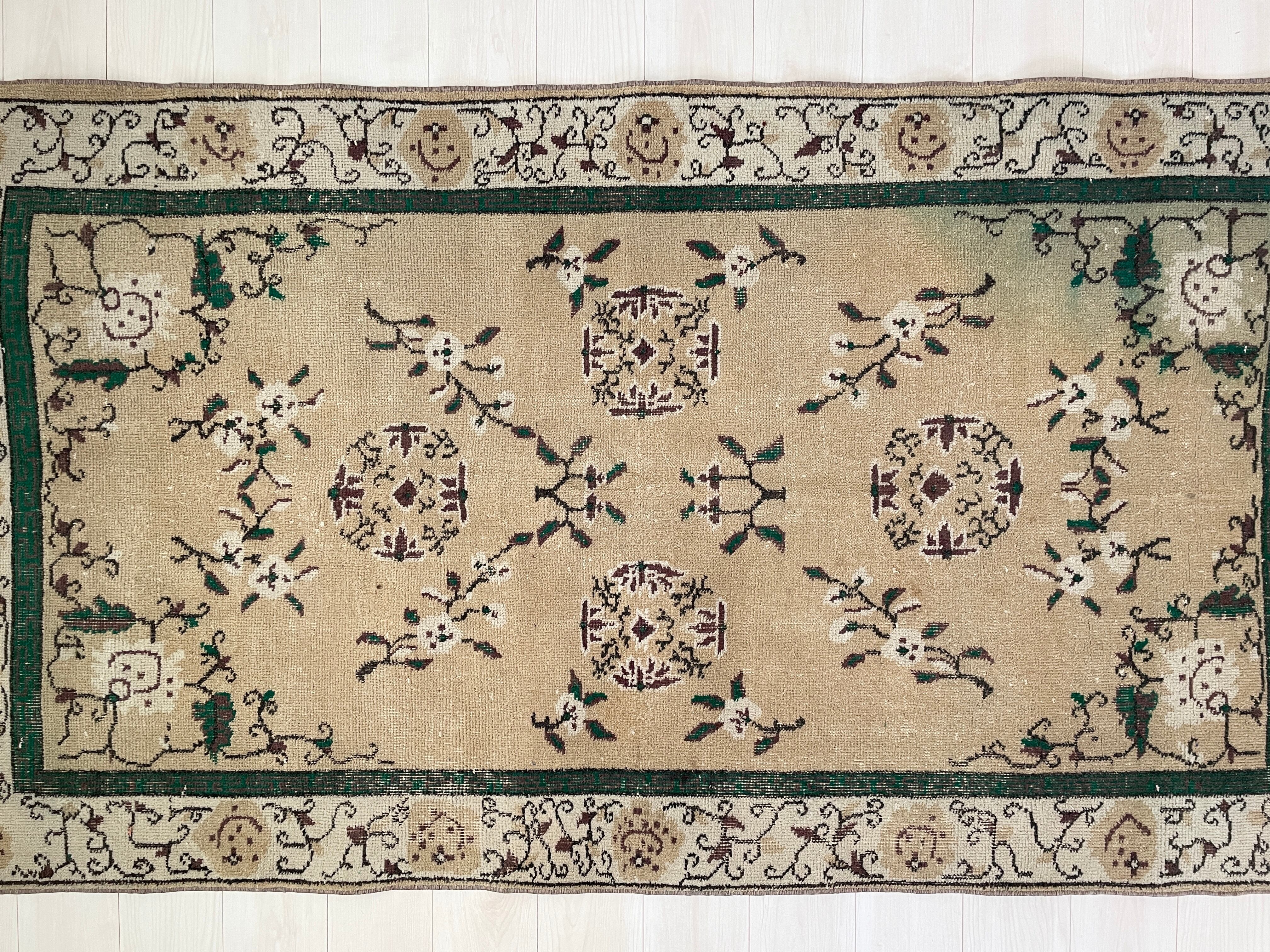 シンプルながらも上品なお花たちで彩られていて、お部屋に華を添えてくれるヴィンテージラグです。