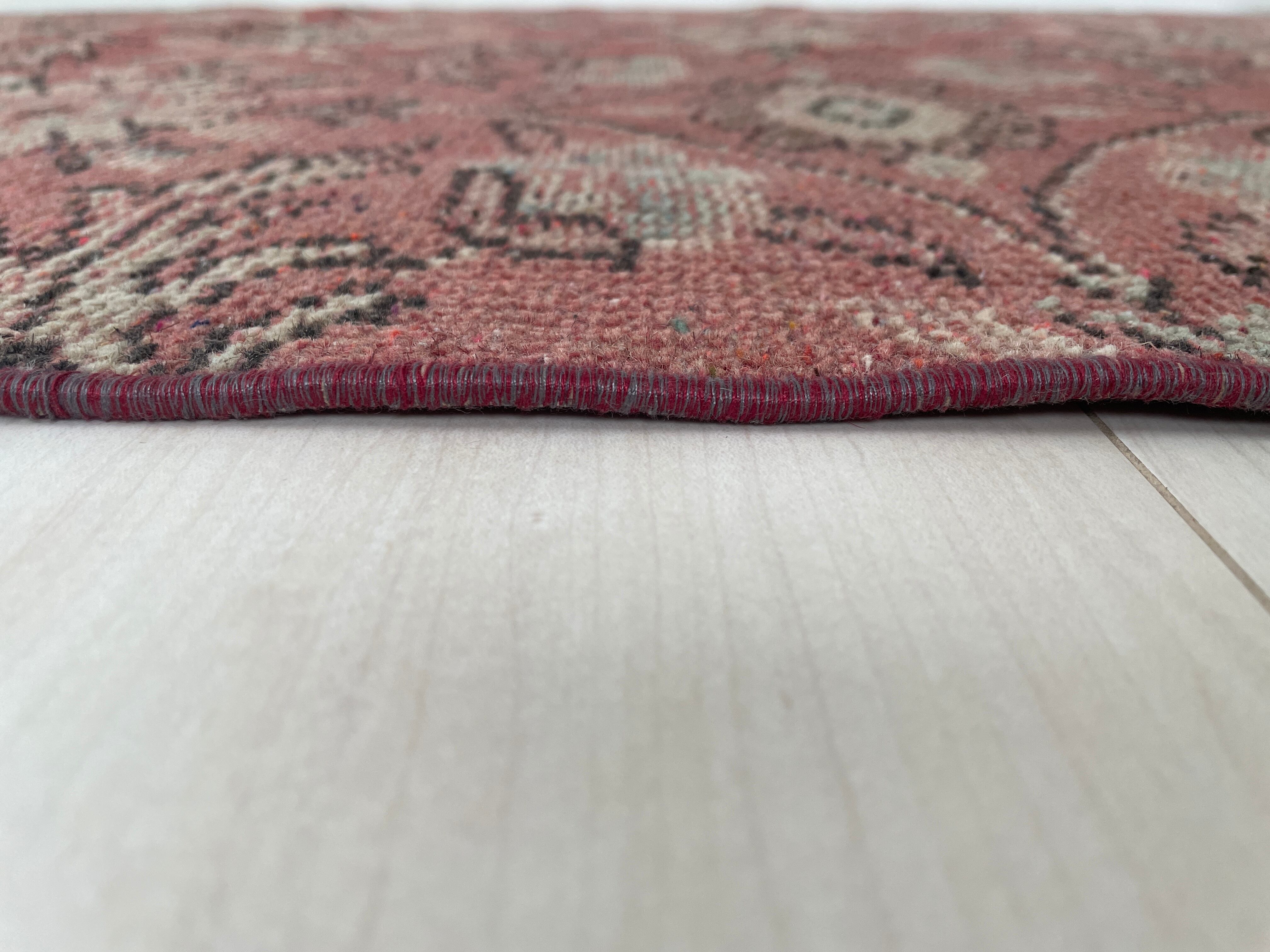 くすんだレッドカラーが独特で、空間を優しく明るくしてくれそうなヴィンテージラグです。