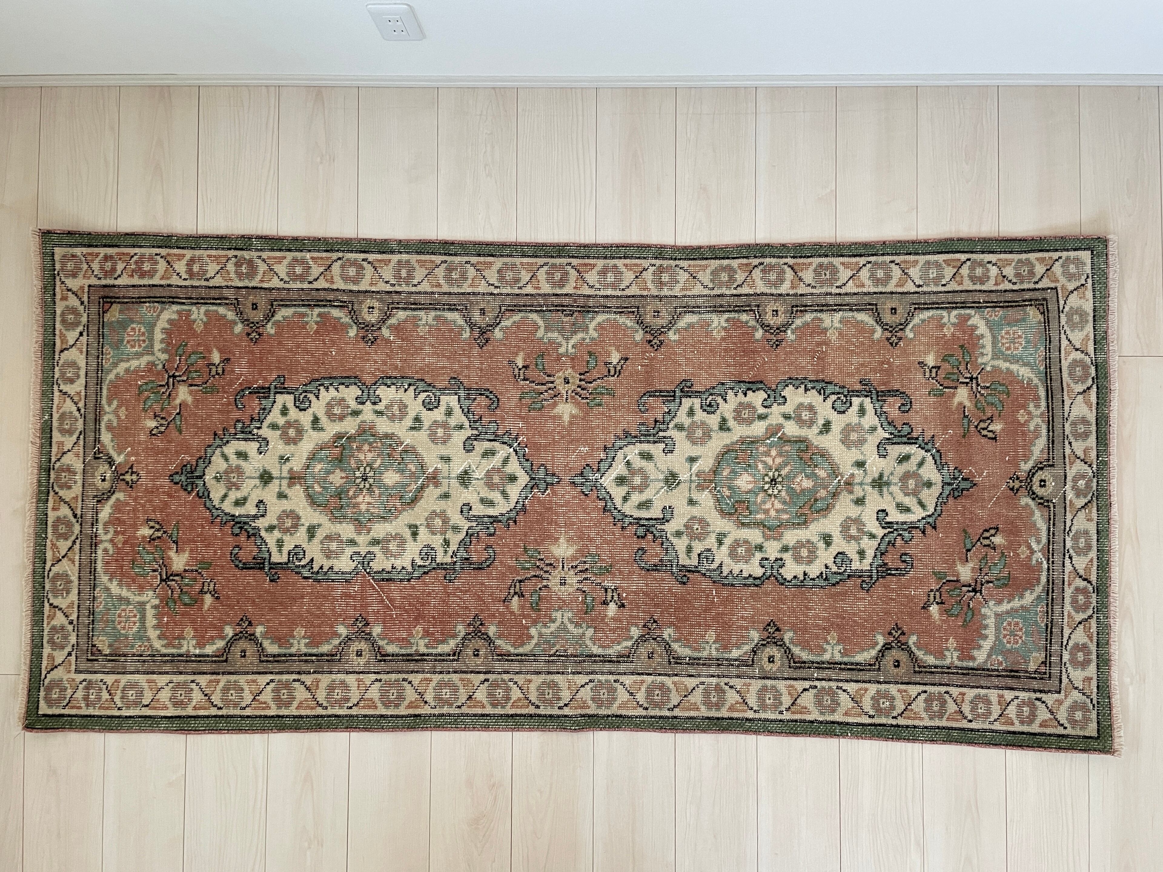 ヴィンテージラグは、糸のほつれ、抜け、毛羽立ち、シミなど見られる場合がございます。ヴィンテージ品ならではの雰囲気としてお楽しみいただけますと幸いです。