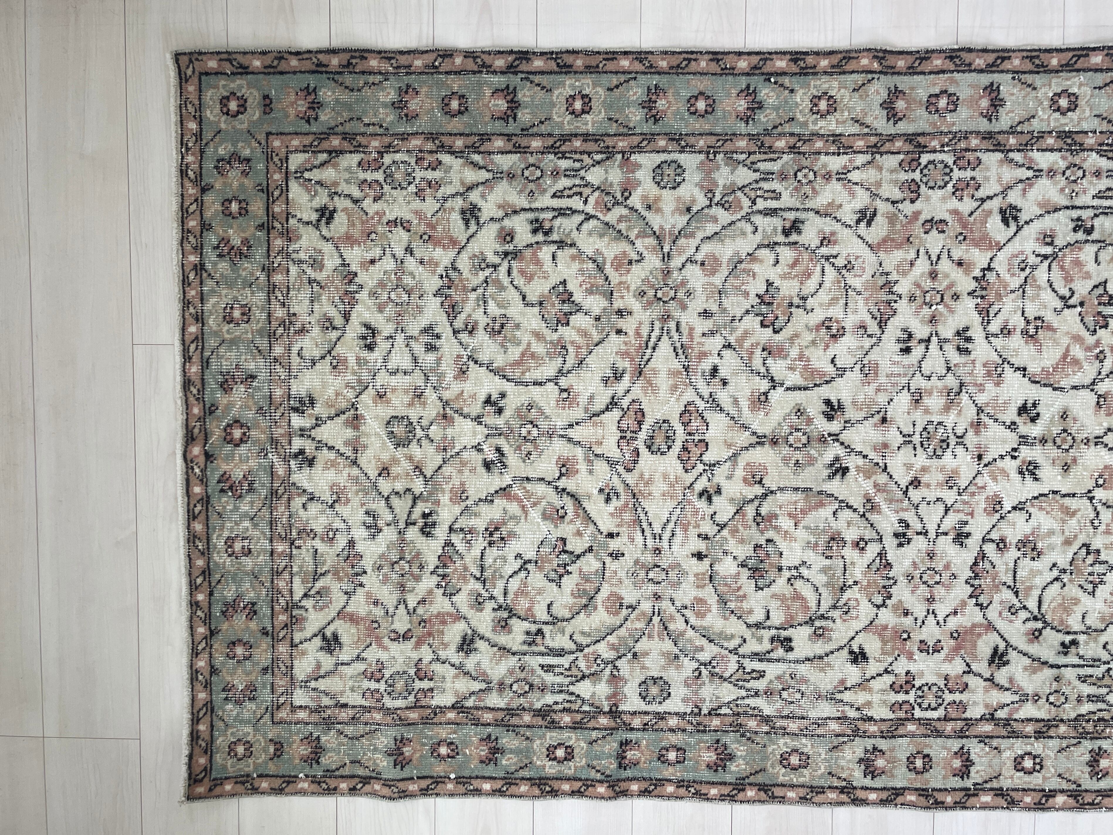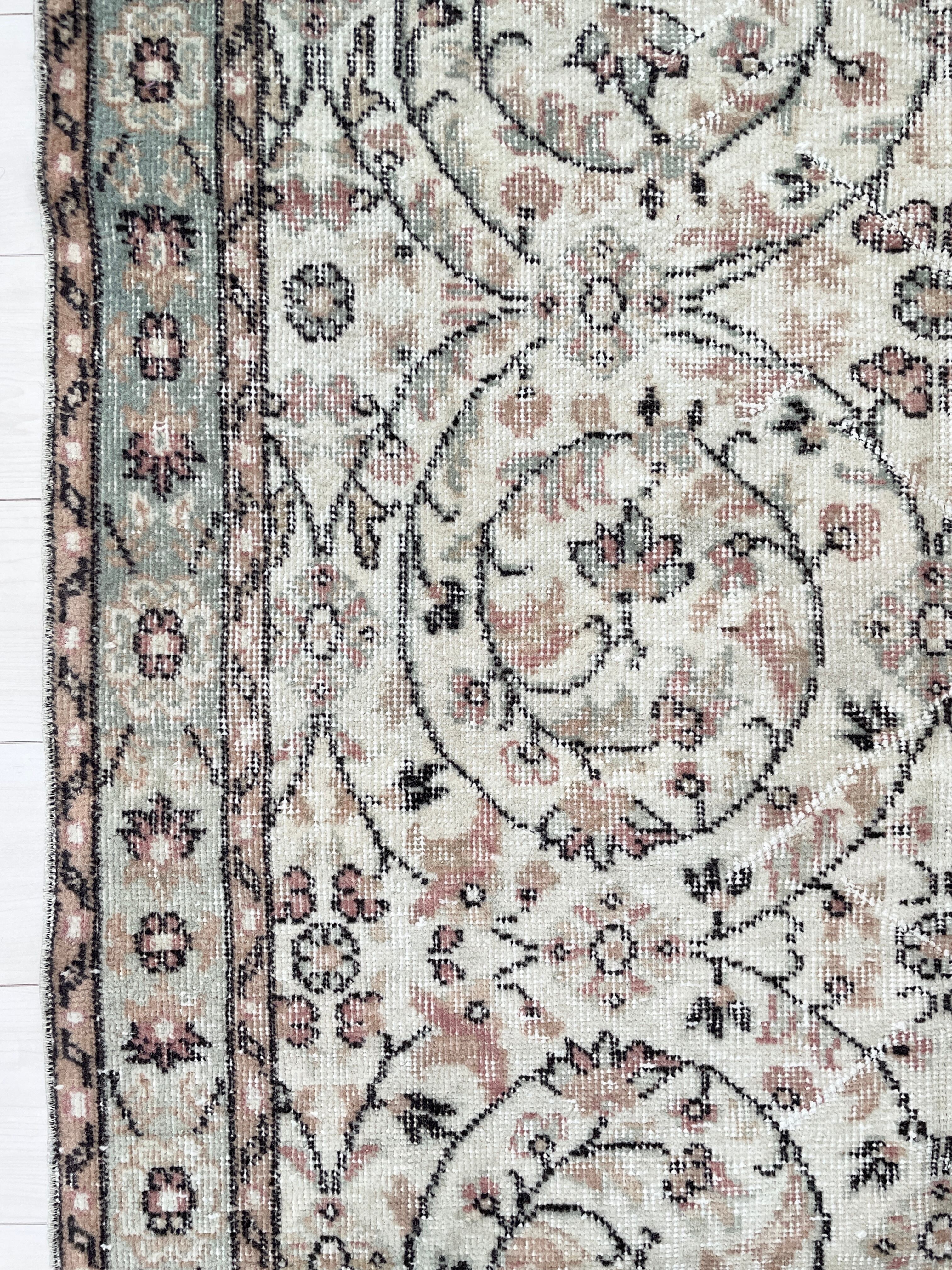 くるくるとうずまくツタに色づく草花が美しいヴィンテージラグ。