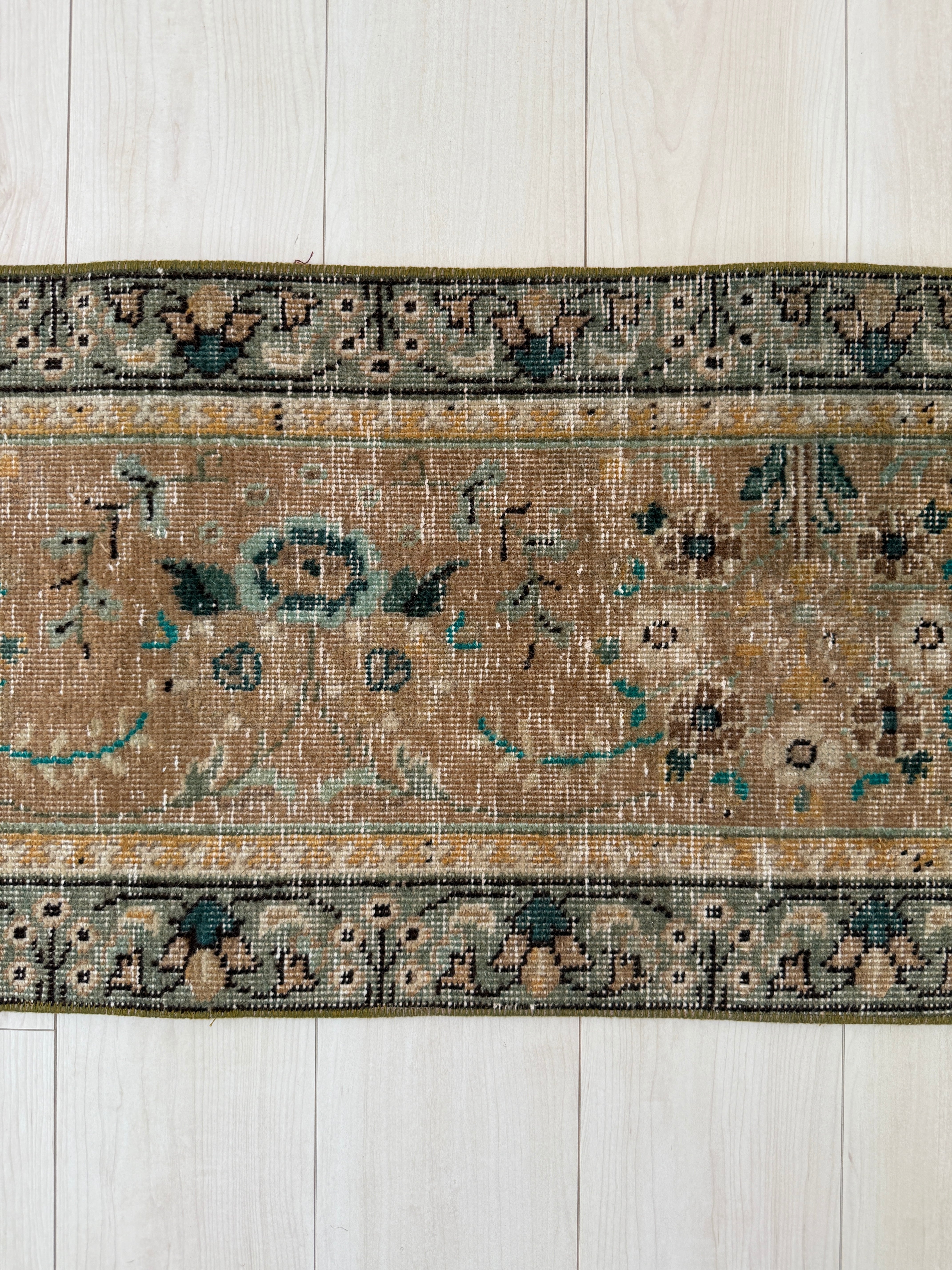 やや渋みのある色合いのお花柄が特徴的なヴィンテージラグ。