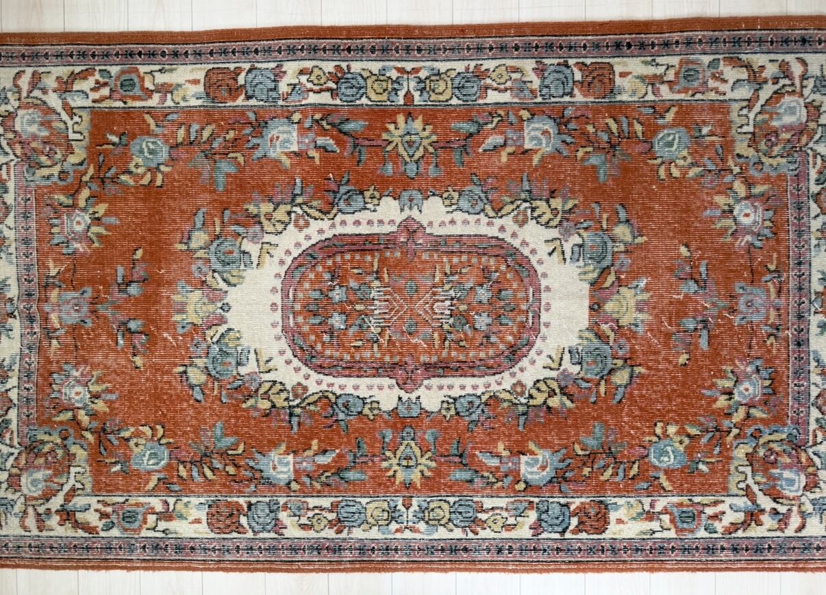 お花がたくさん並んだ華やかなヴィンテージラグ。