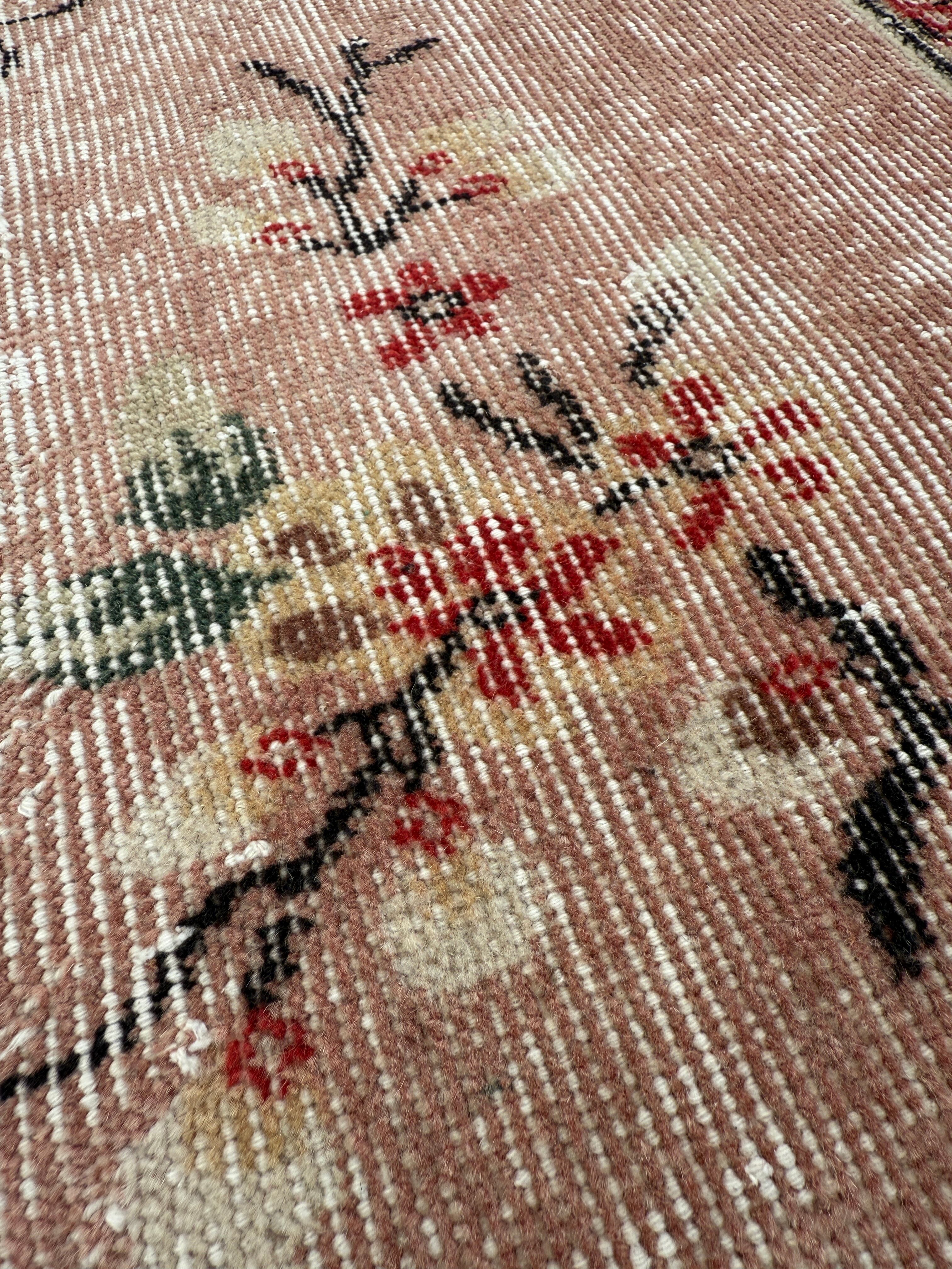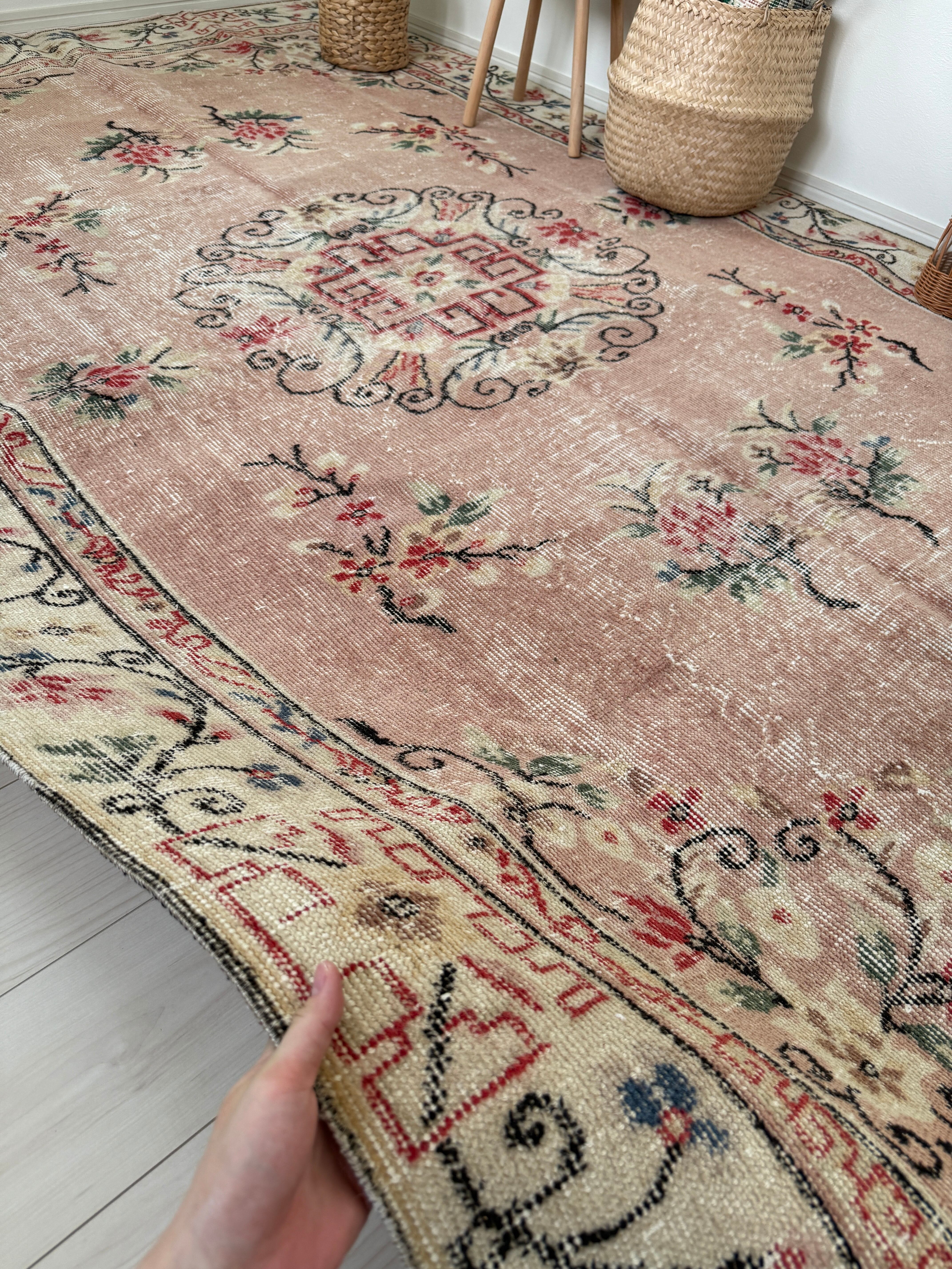 ピンクカラーが空間を明るくしてくれる魅力的なヴィンテージラグ。