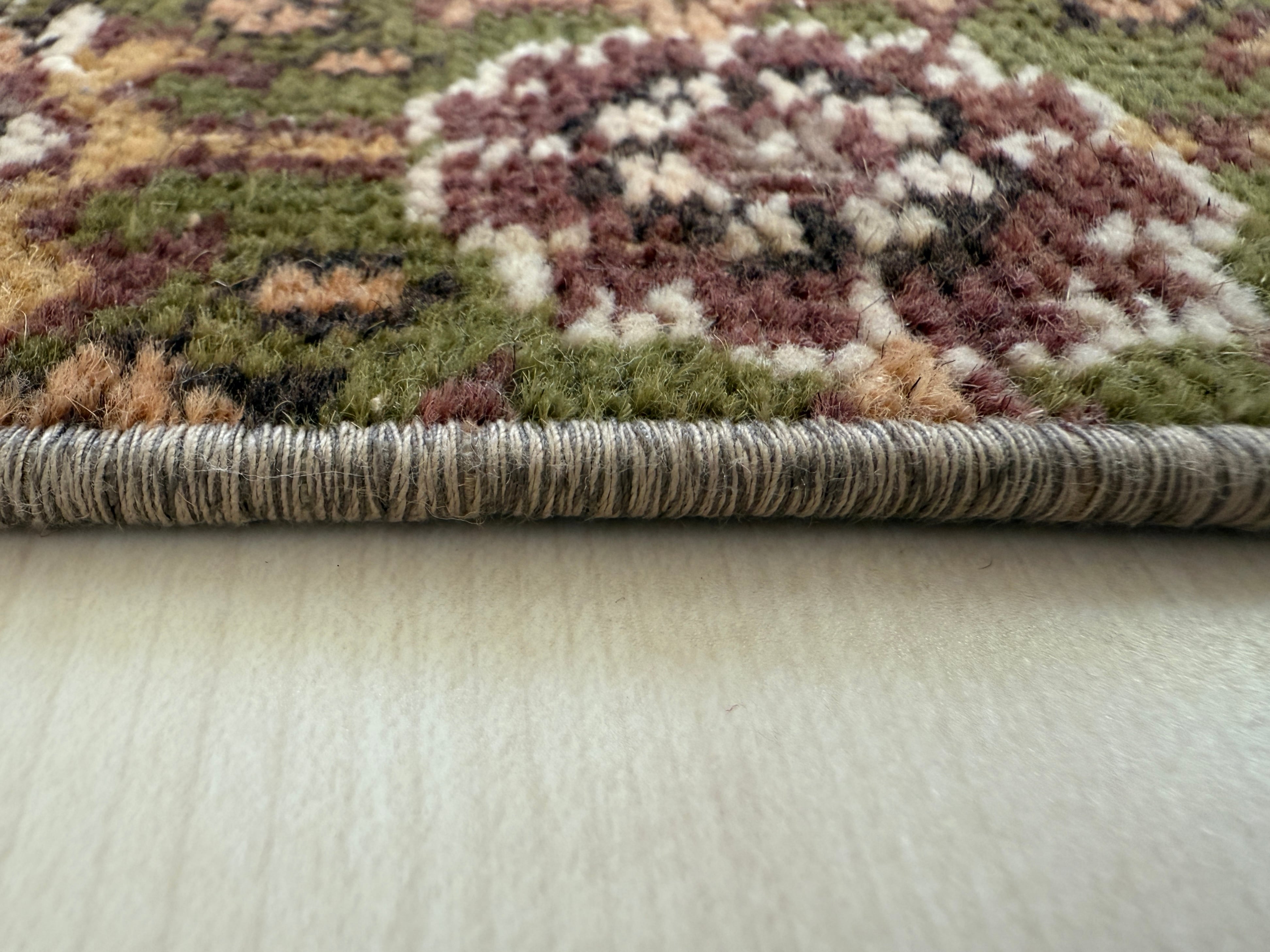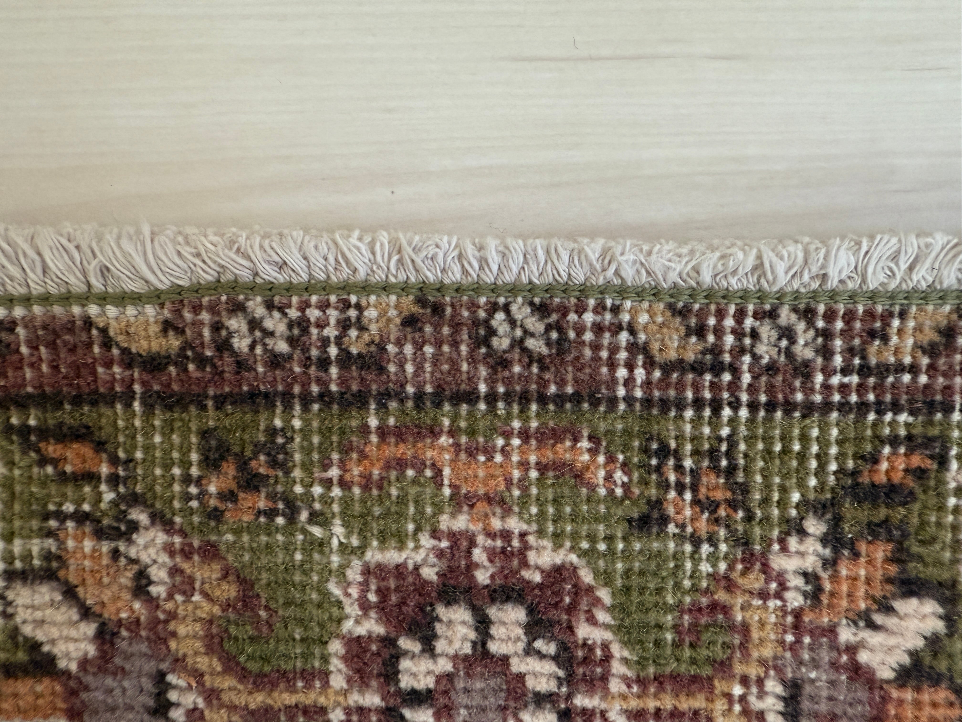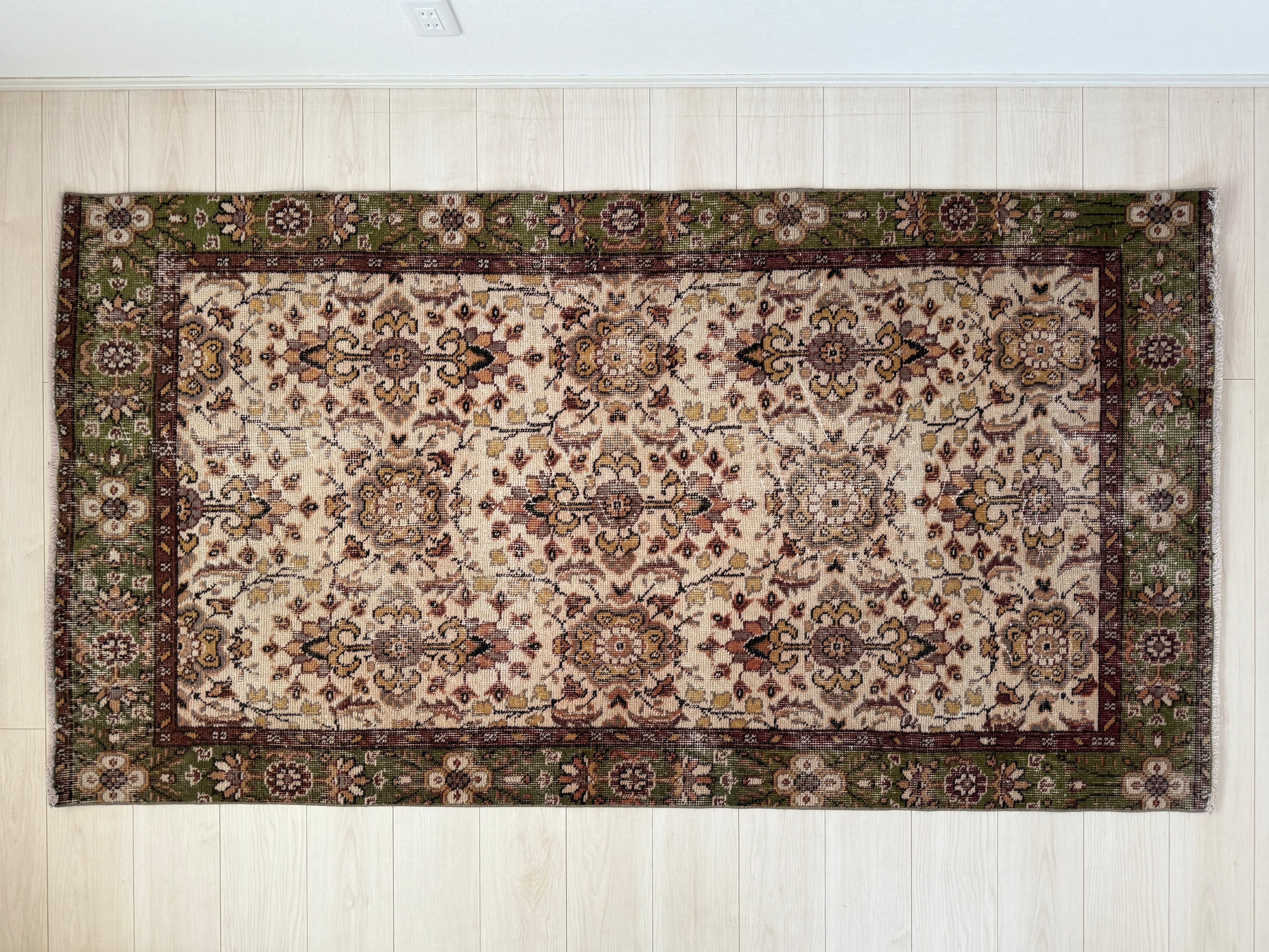 やわらかなベージュをベースにブラウンやグリーンの落ち着いた色合いで描かれた、クラシカルなフラワーパターンのヴィンテージラグ。
