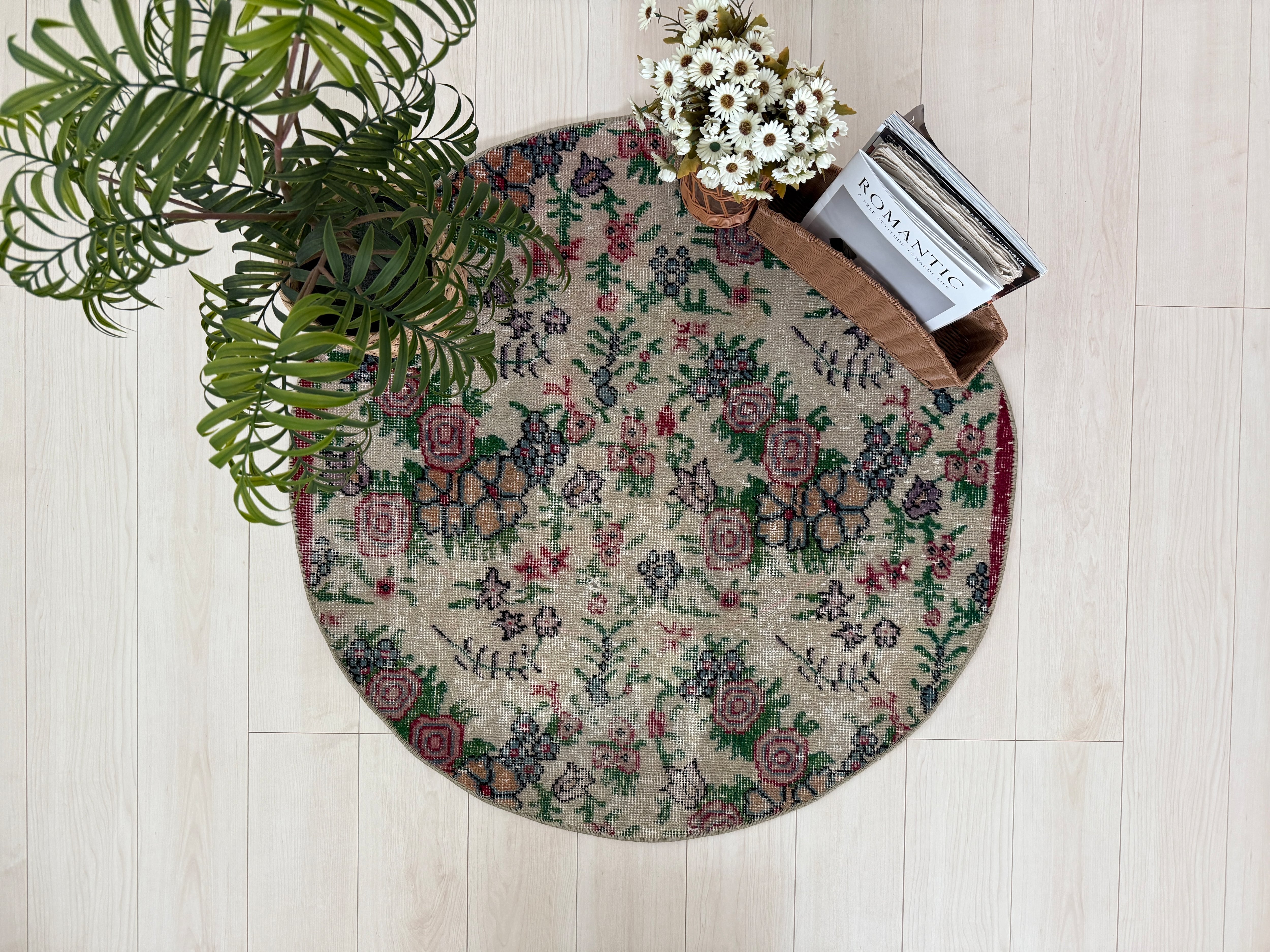 お花が咲いたようなお花柄ヴィンテージラグなので、敷いてあるだけでもインテリアになりますよ。