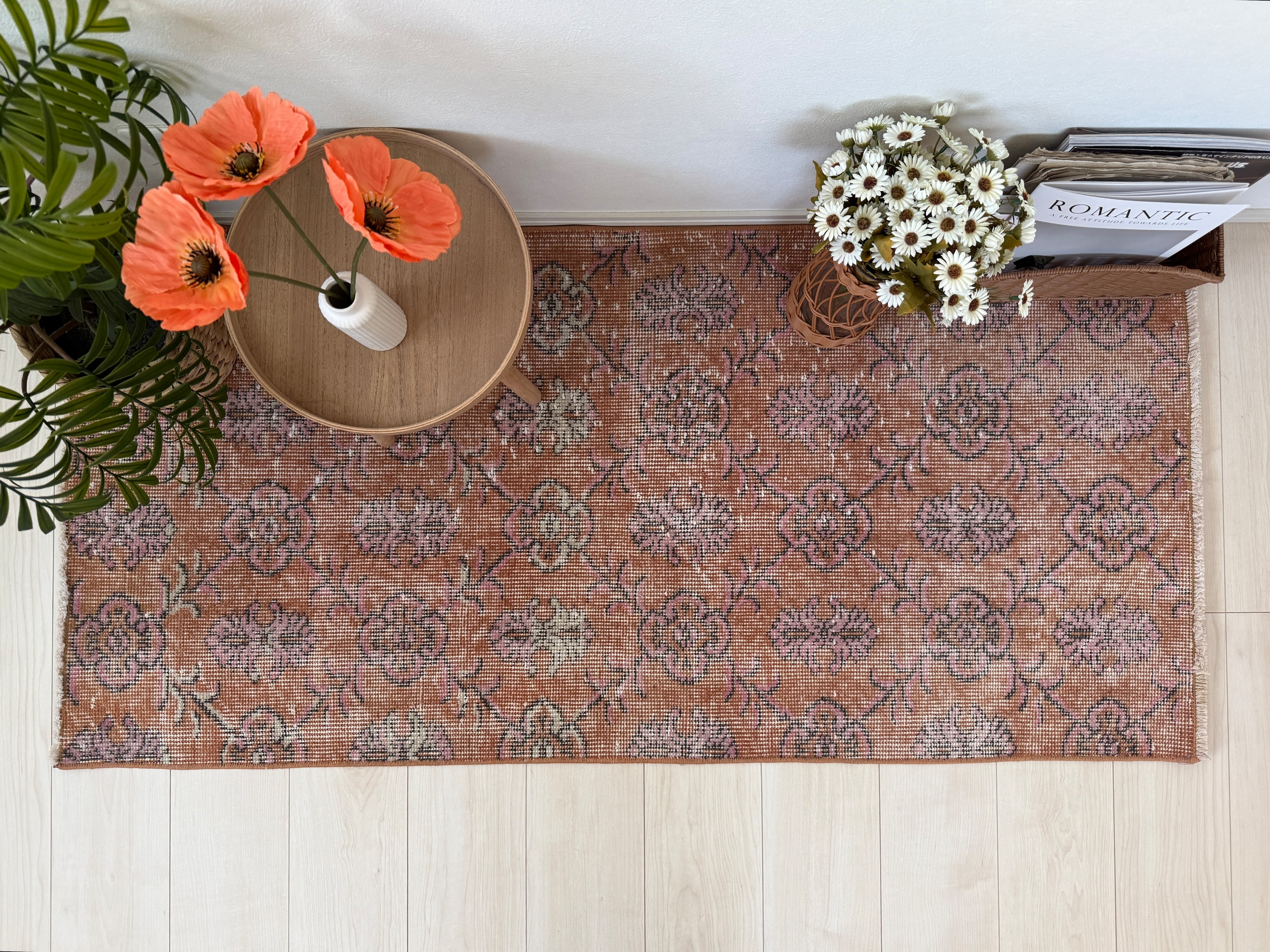 お花が咲いたようなお花柄ヴィンテージラグなので、敷いてあるだけでもインテリアになりますよ。