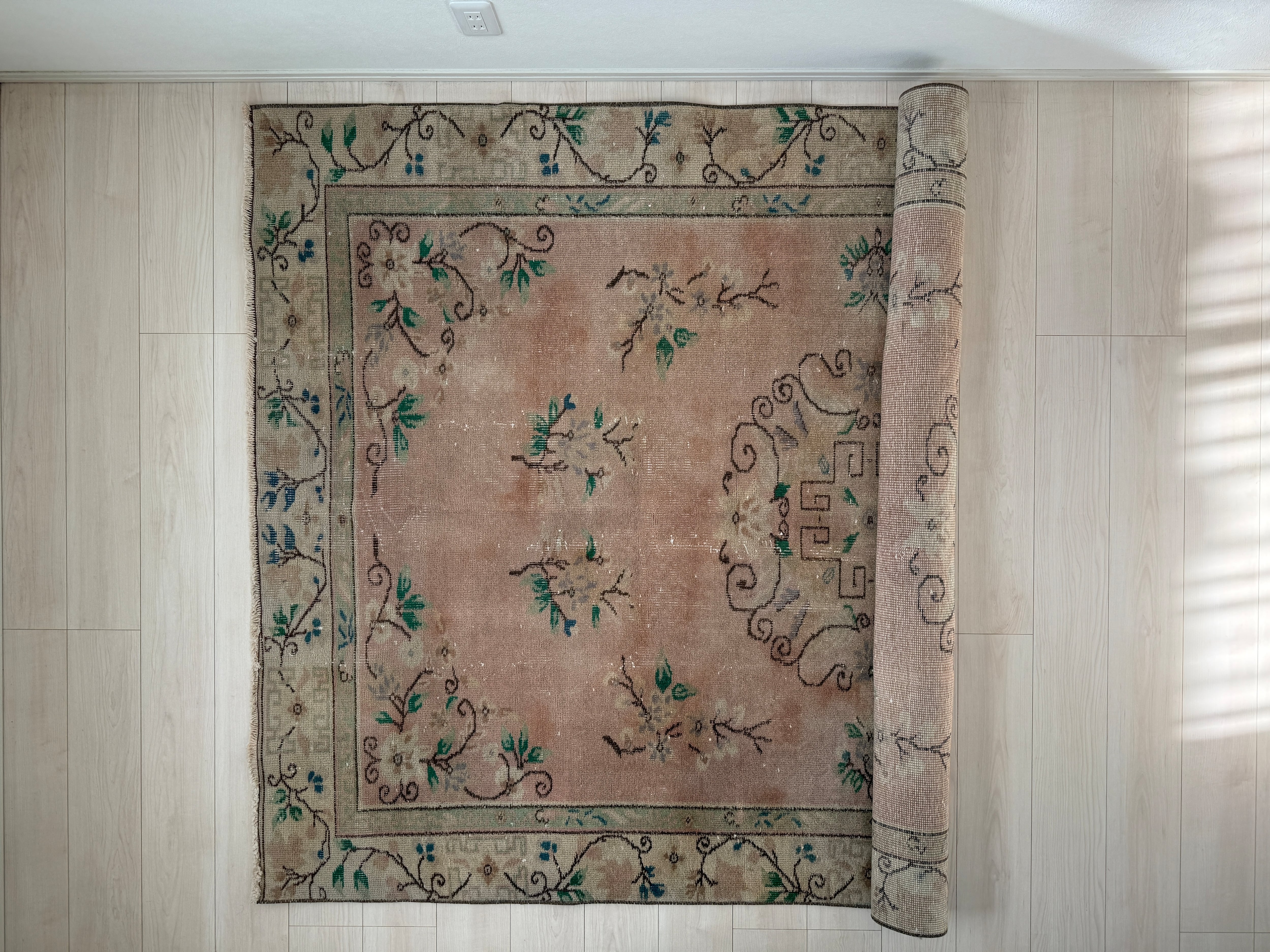 ピンクカラーが空間を明るくしてくれる魅力的なヴィンテージラグ。