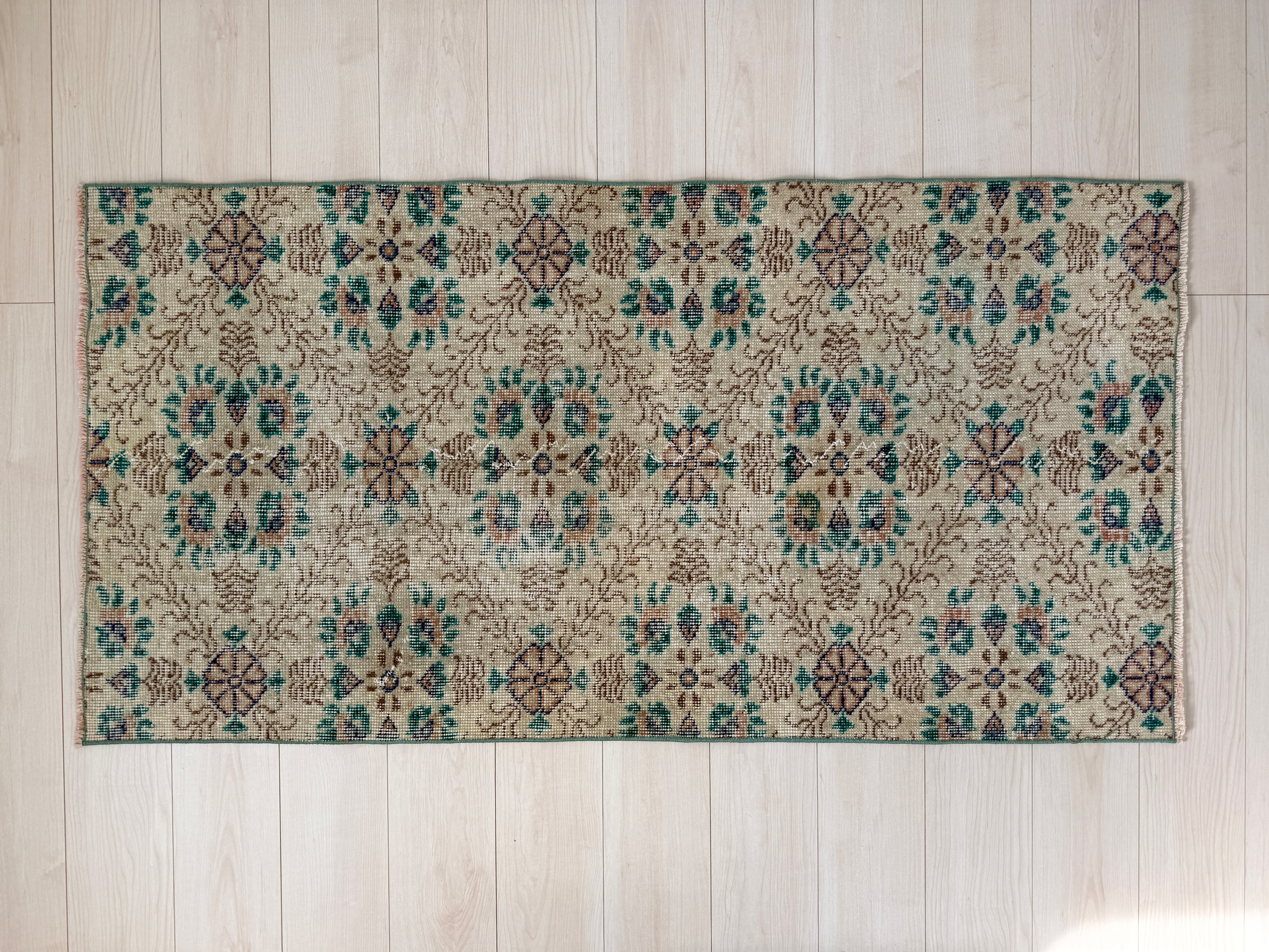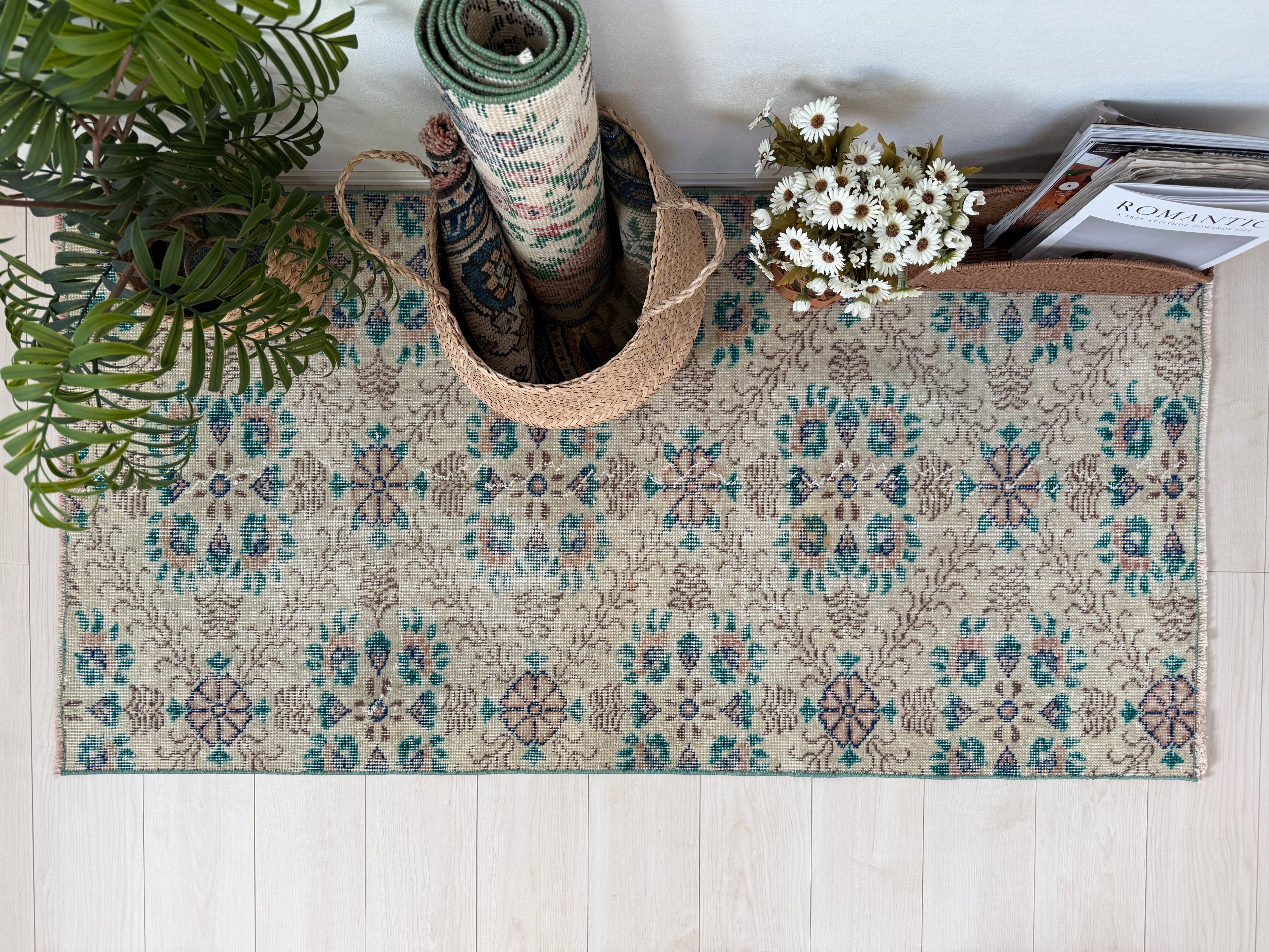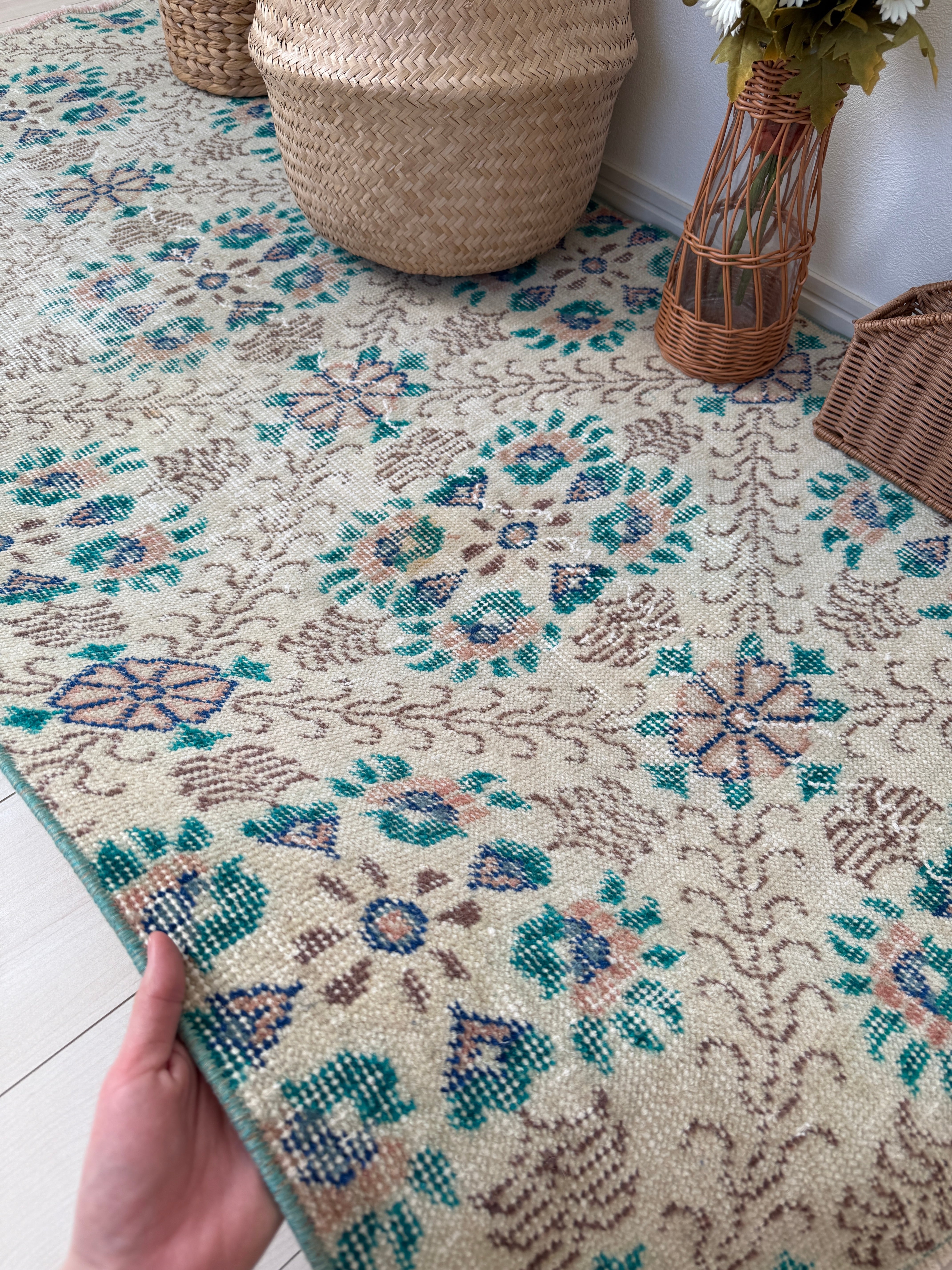 お花が咲いたようなお花柄ヴィンテージラグなので、敷いてあるだけでもインテリアになりますよ。