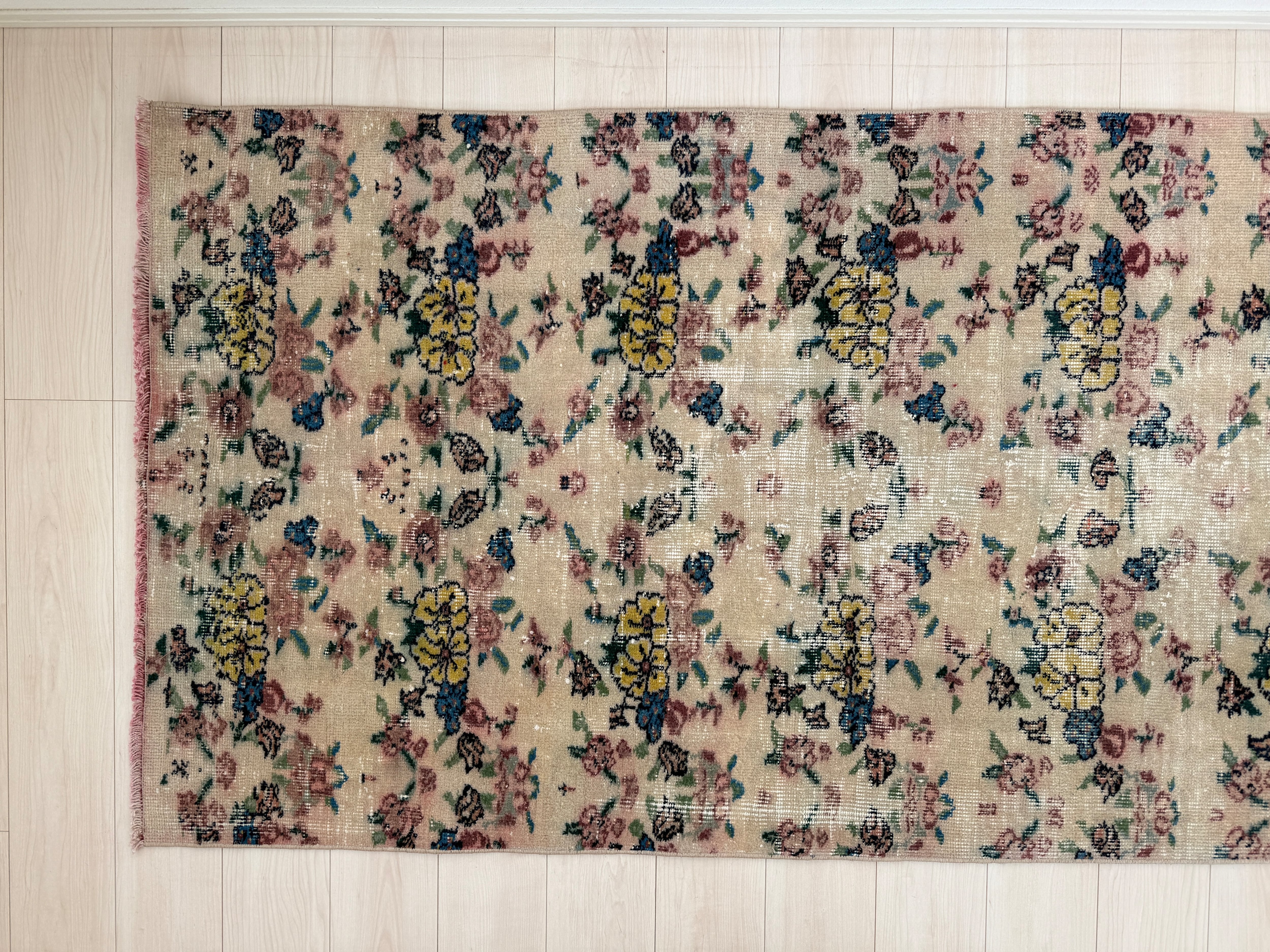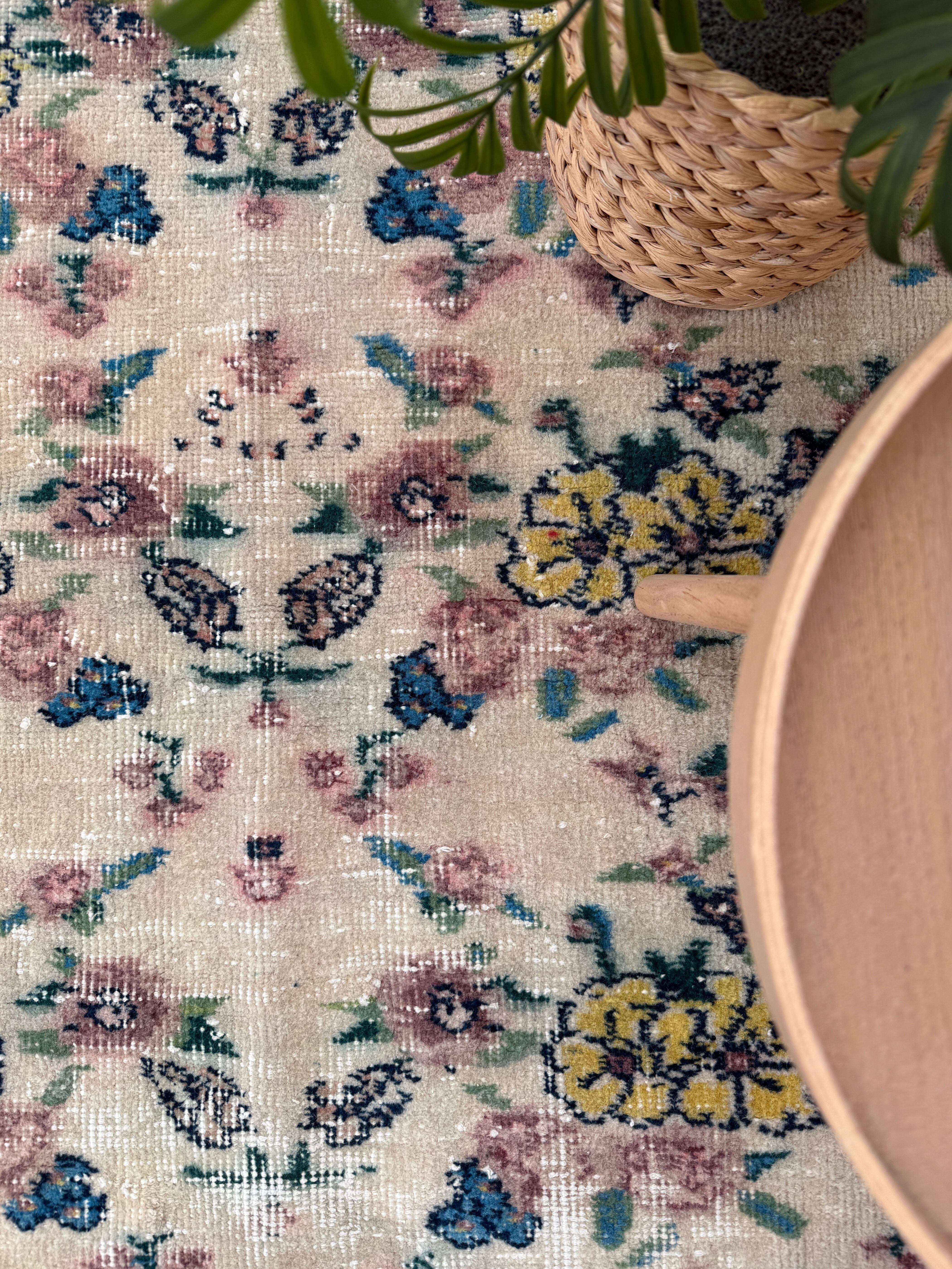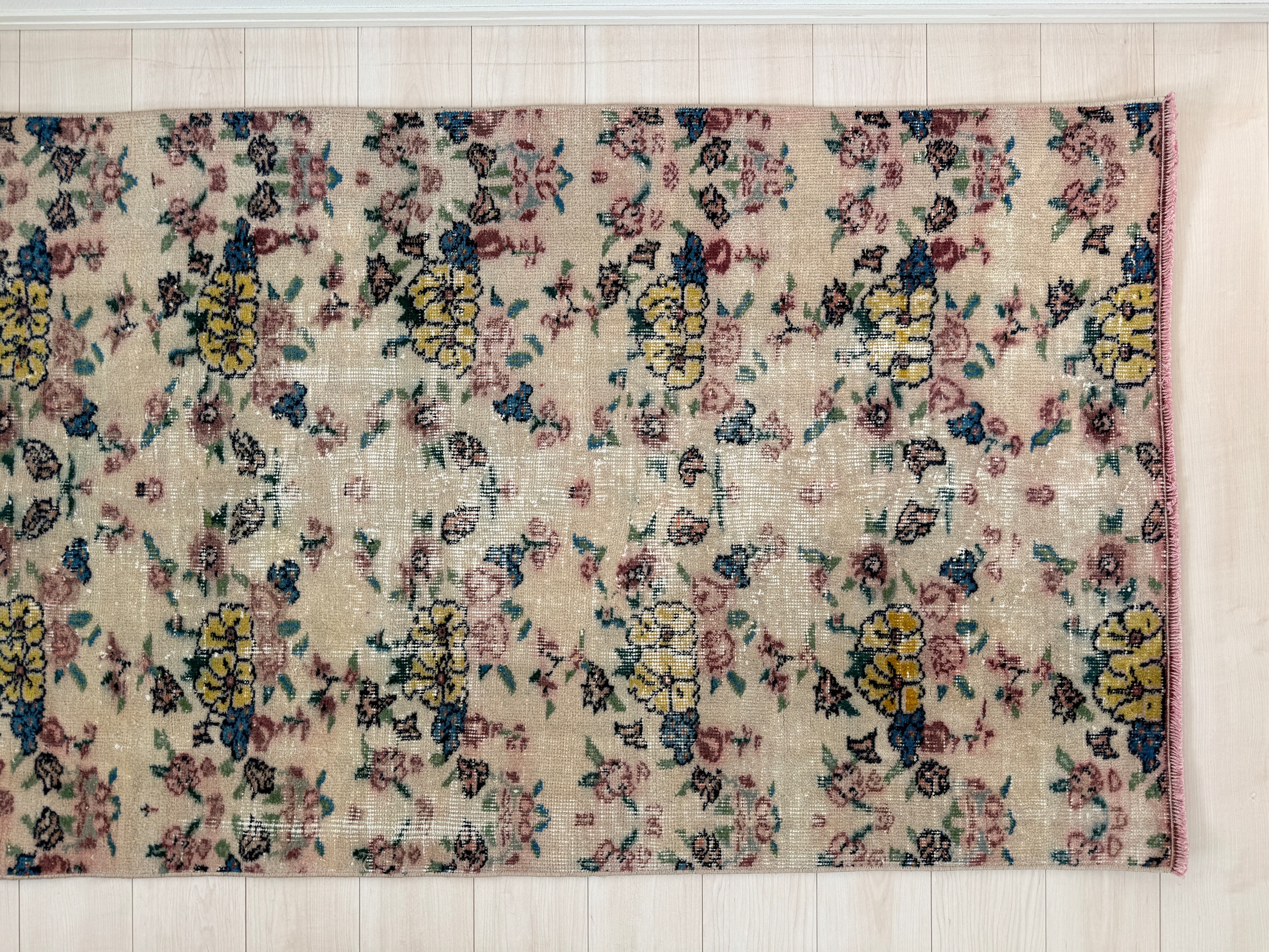 ブーケのように華やかで、優しい色合いのヴィンテージラグ。
