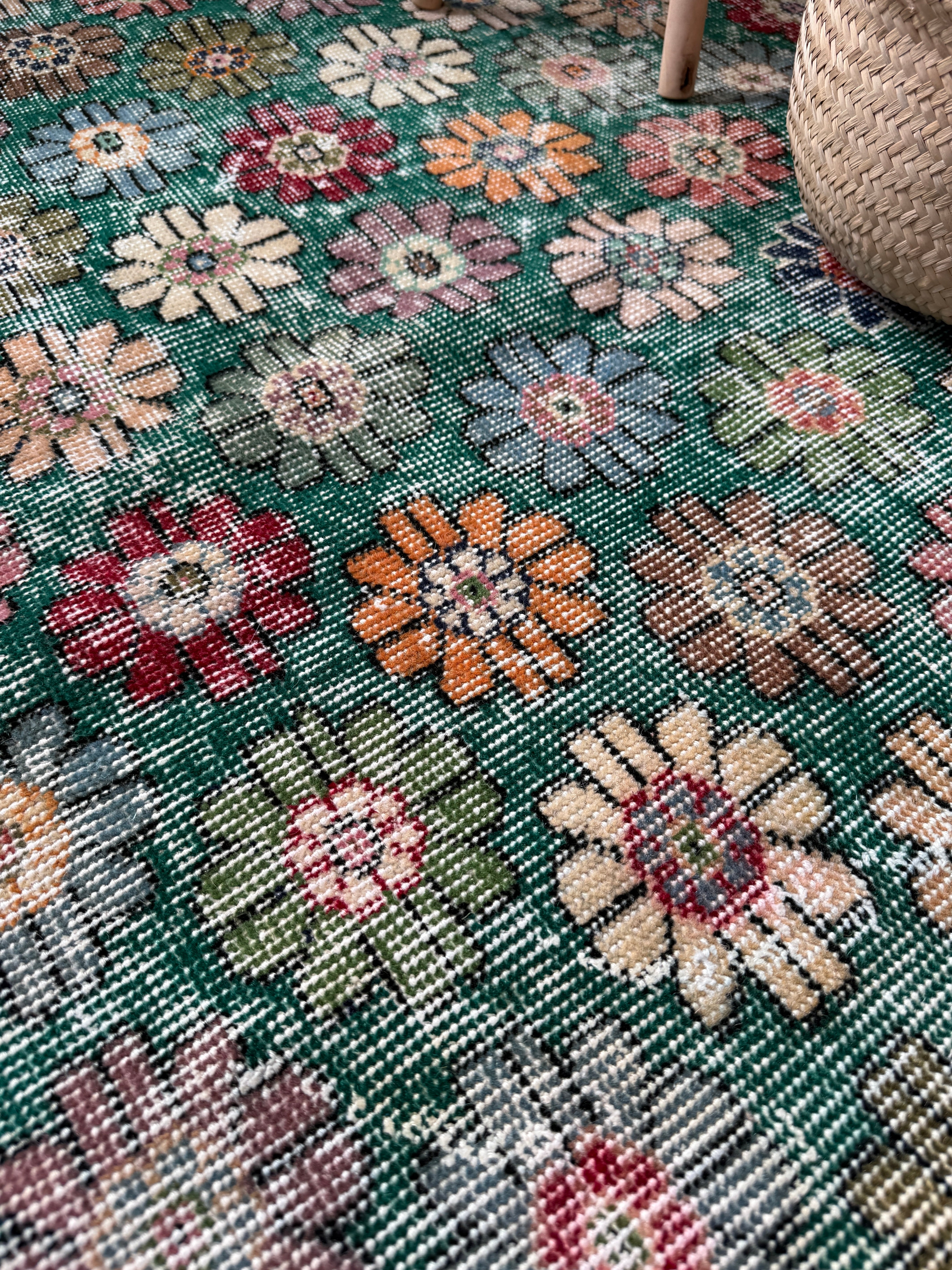 満開のお花たちが並んだ華やかで、貴重なデザインのヴィンテージラグ。