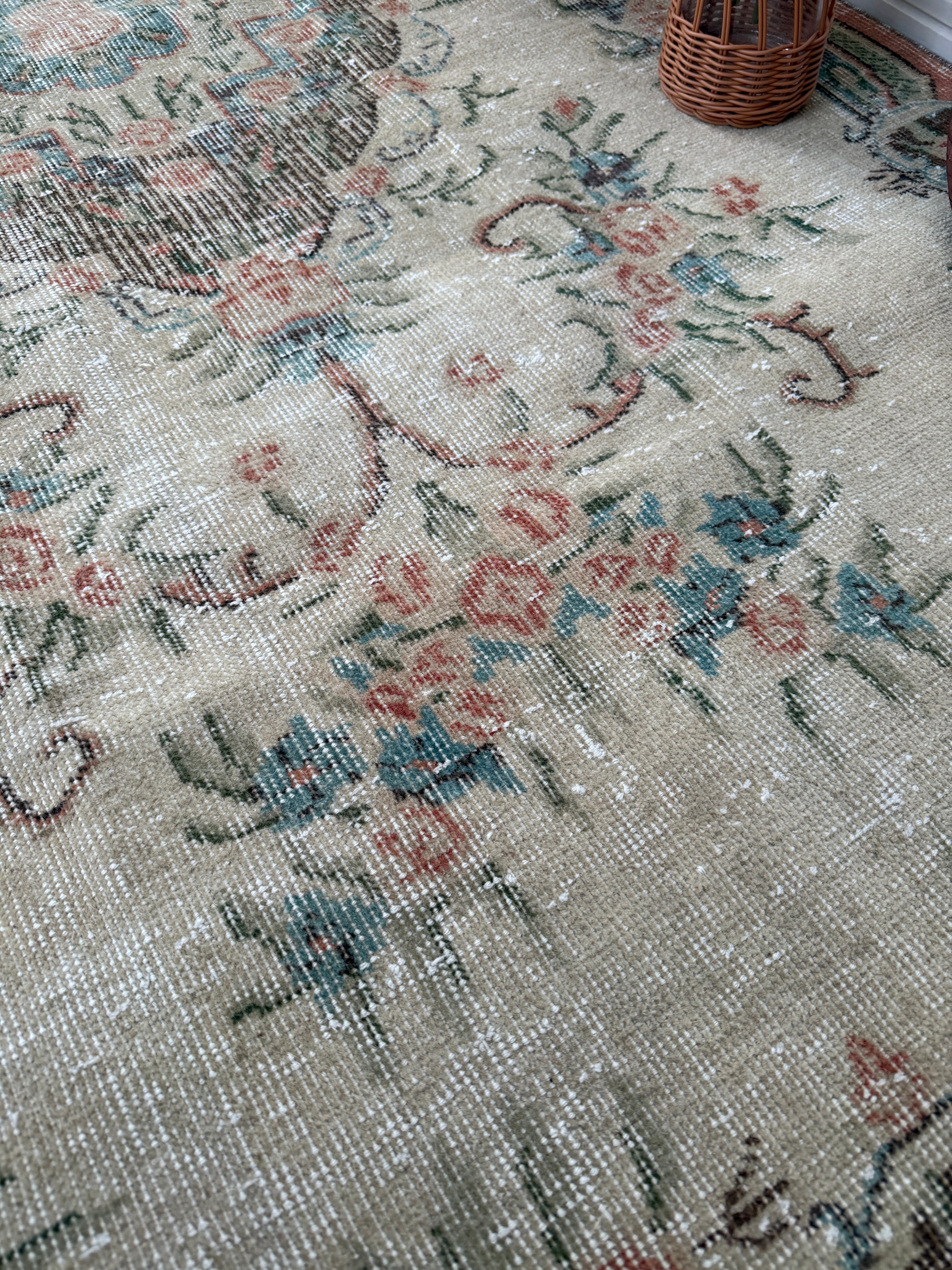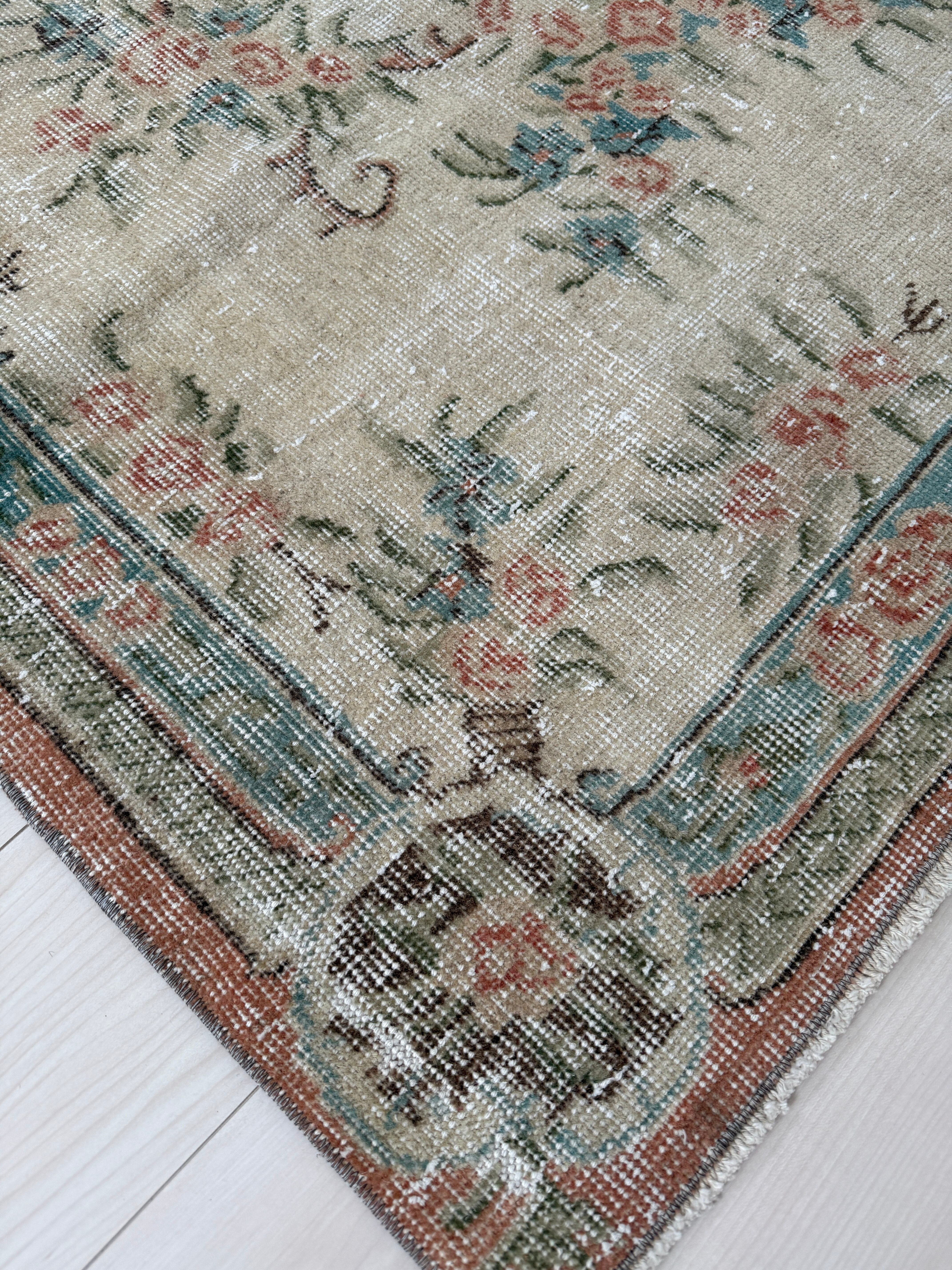 中央のメダリオンから広がる繊細な草花模様が、お部屋にスッと溶け込みながら空間に上品な華やかさを添えてくれます。