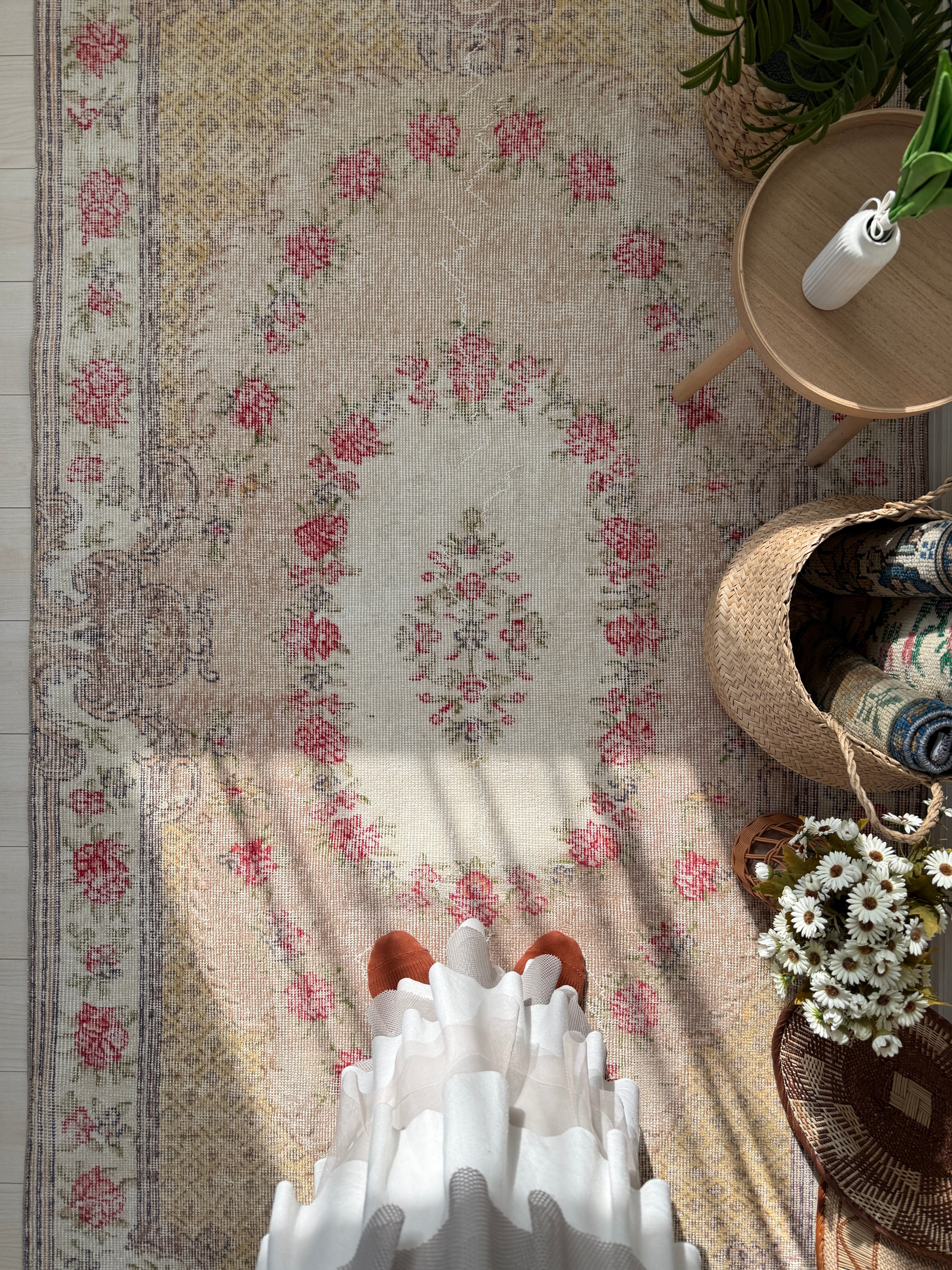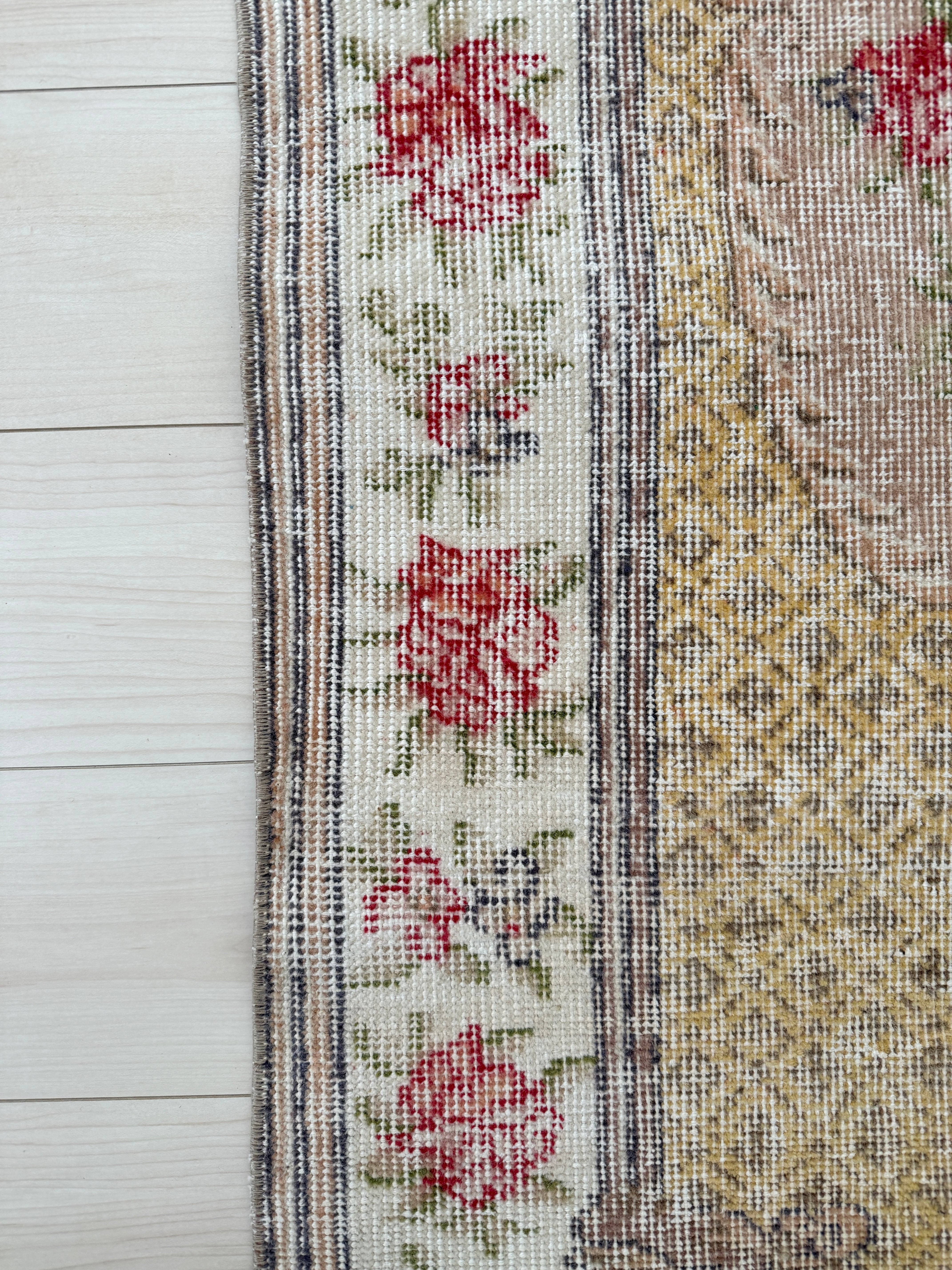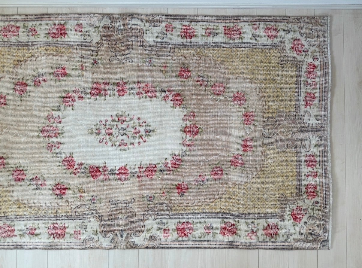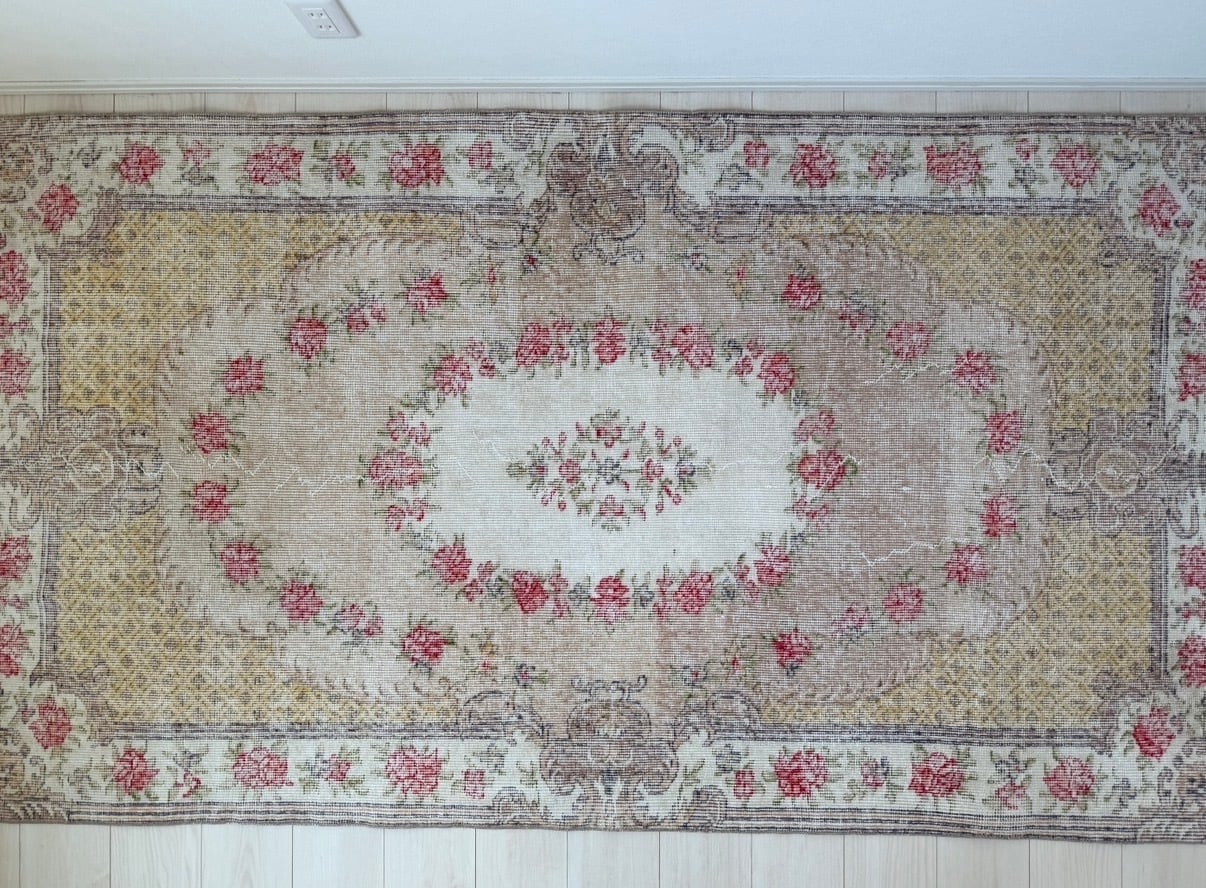 【約119.5cm×約213.5cm】70's vintage rug -"pink brown flower"-