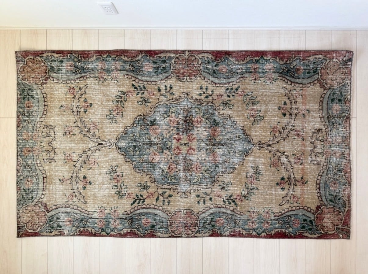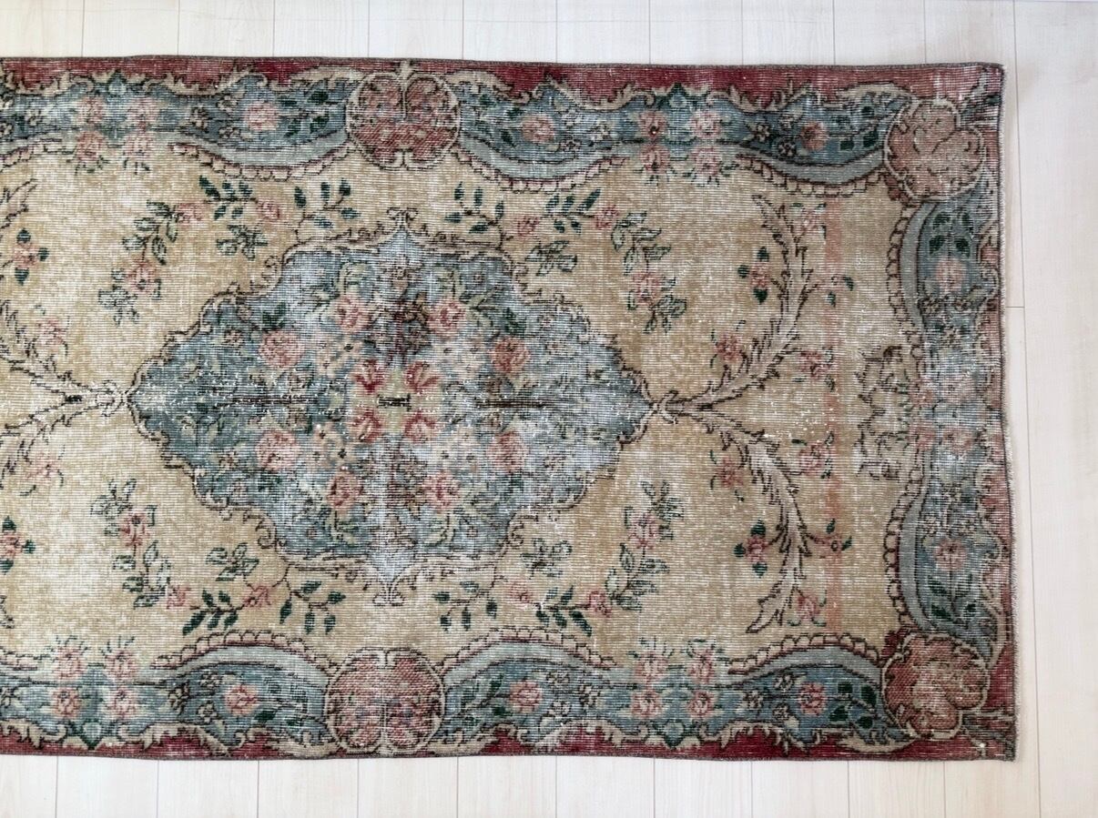 【約111.2cm×約196.5cm】70's vintage rug -"pink blue floral"-