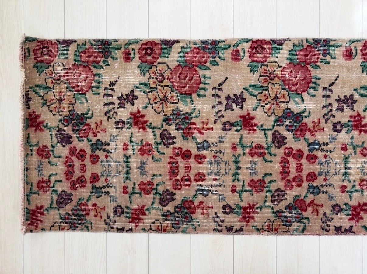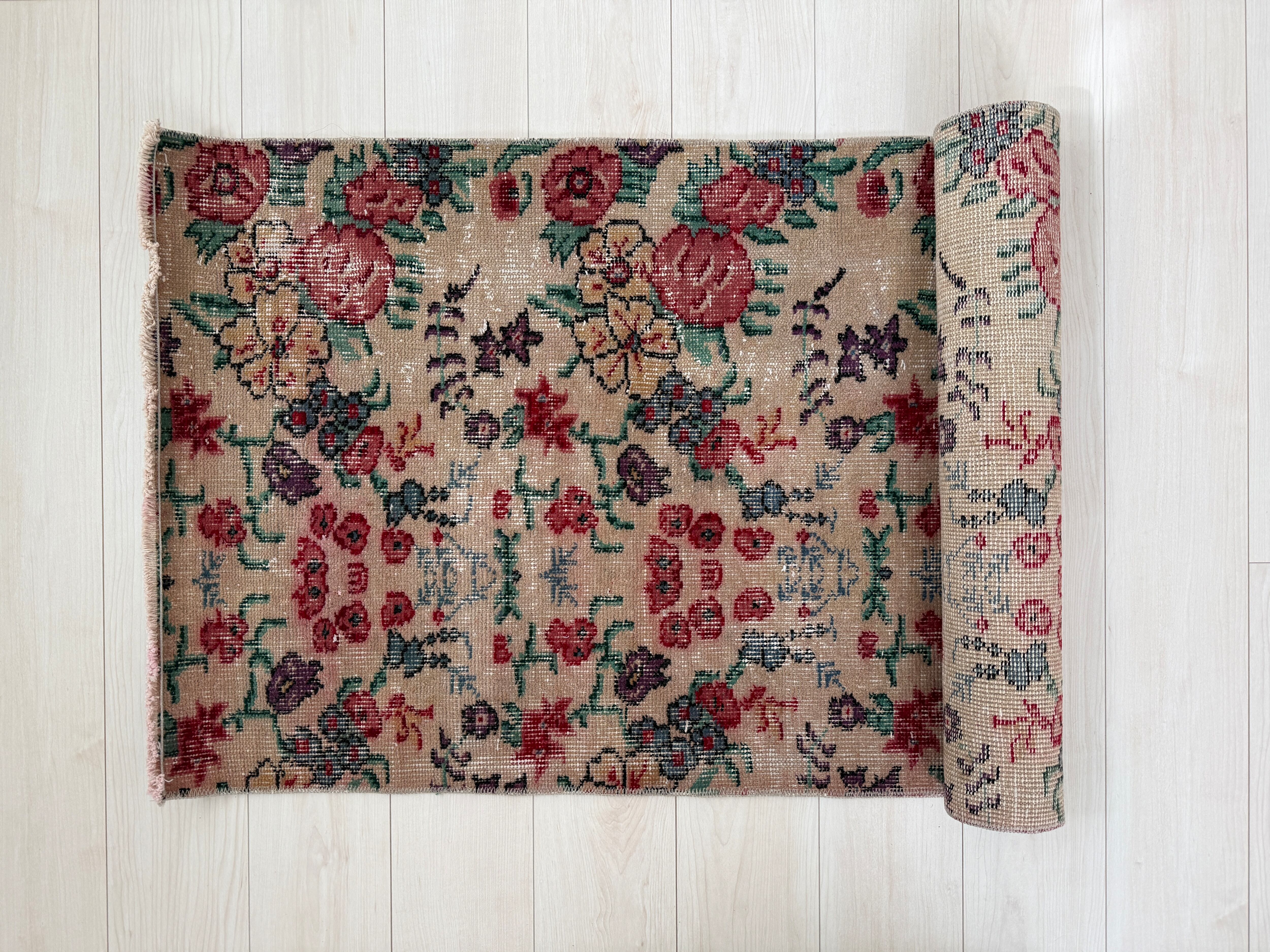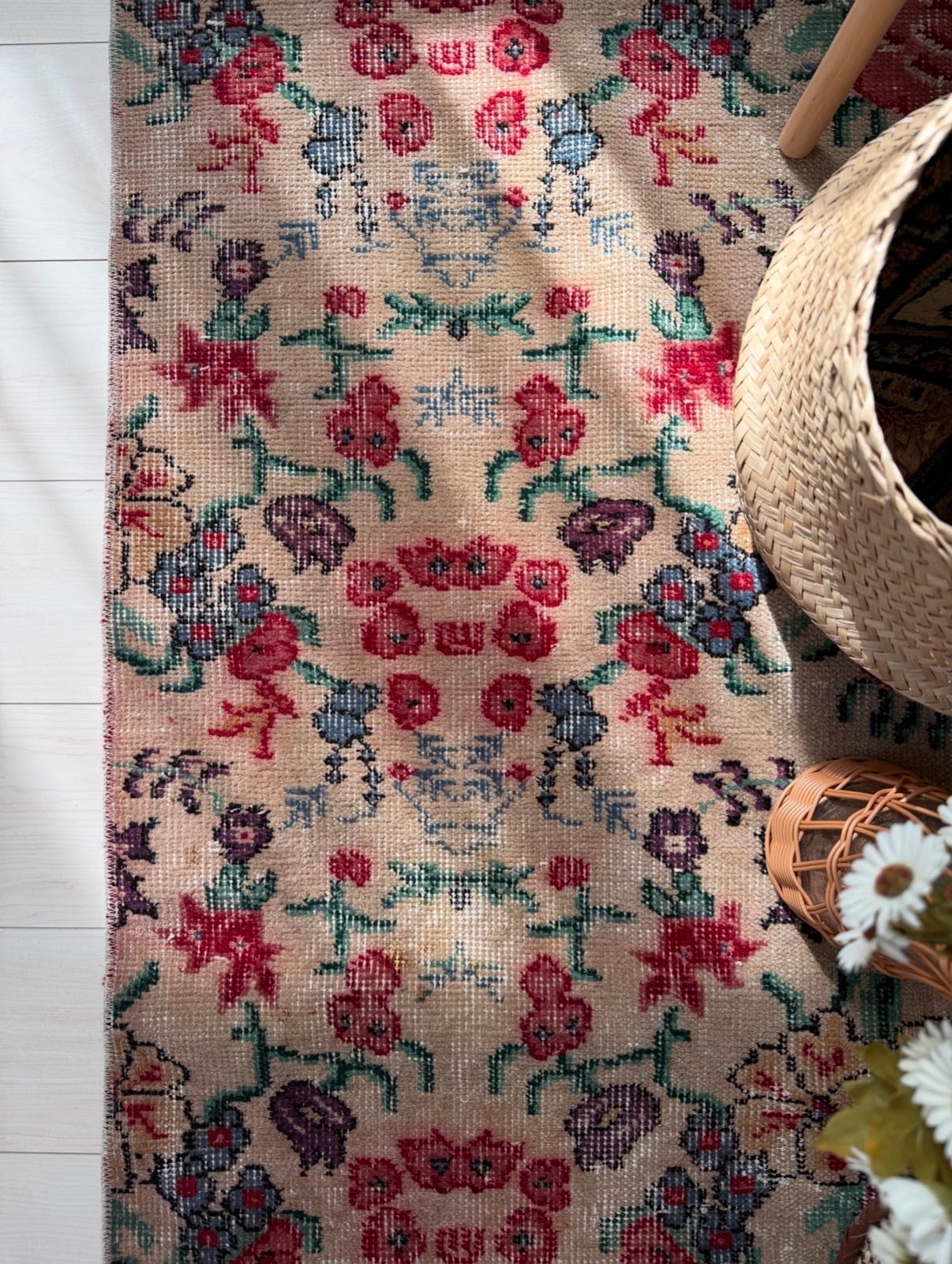 やさしいベージュのベースに小さなお花のブーケが並ぶように描かれた、可愛らしいヴィンテージラグ。