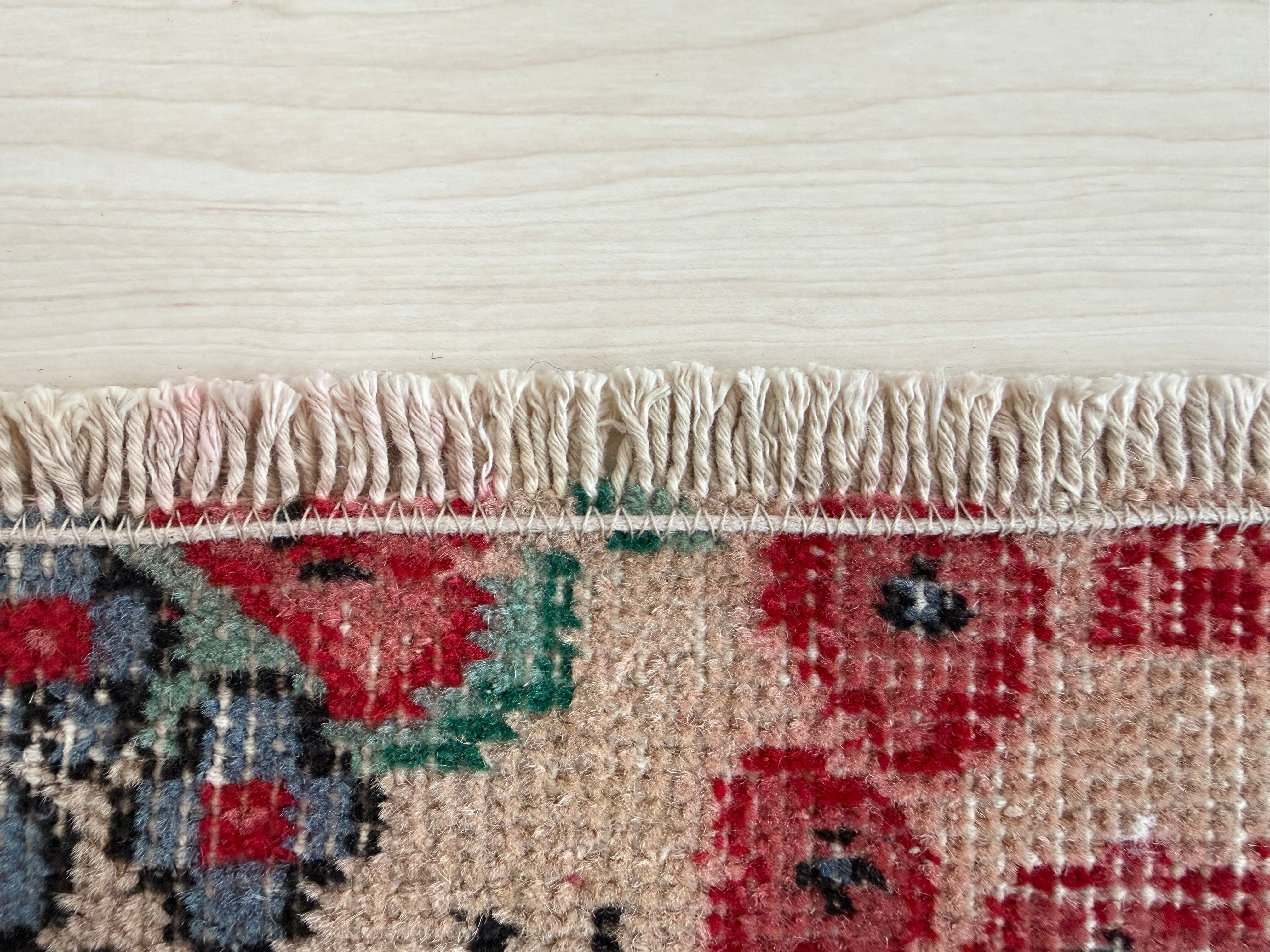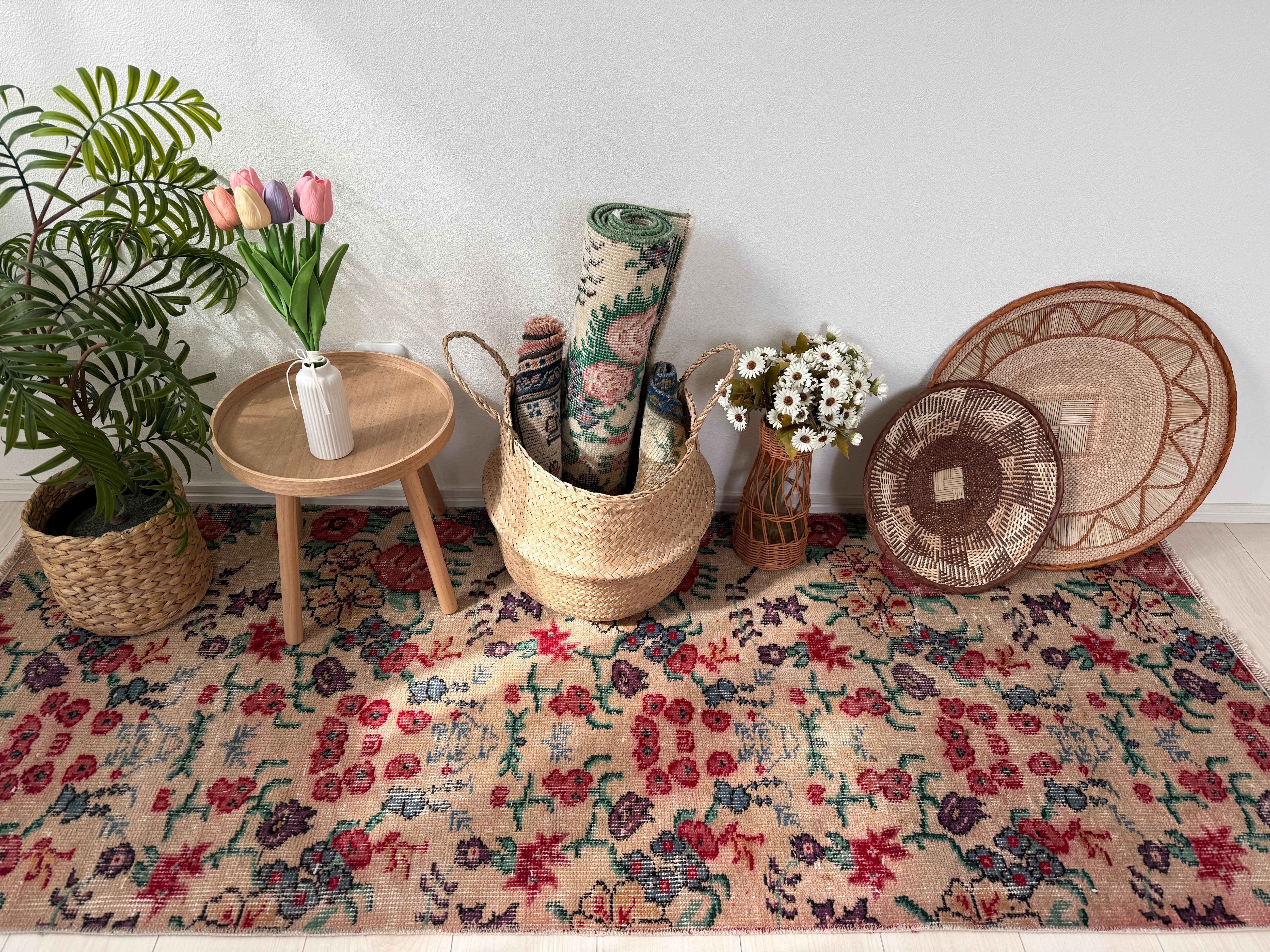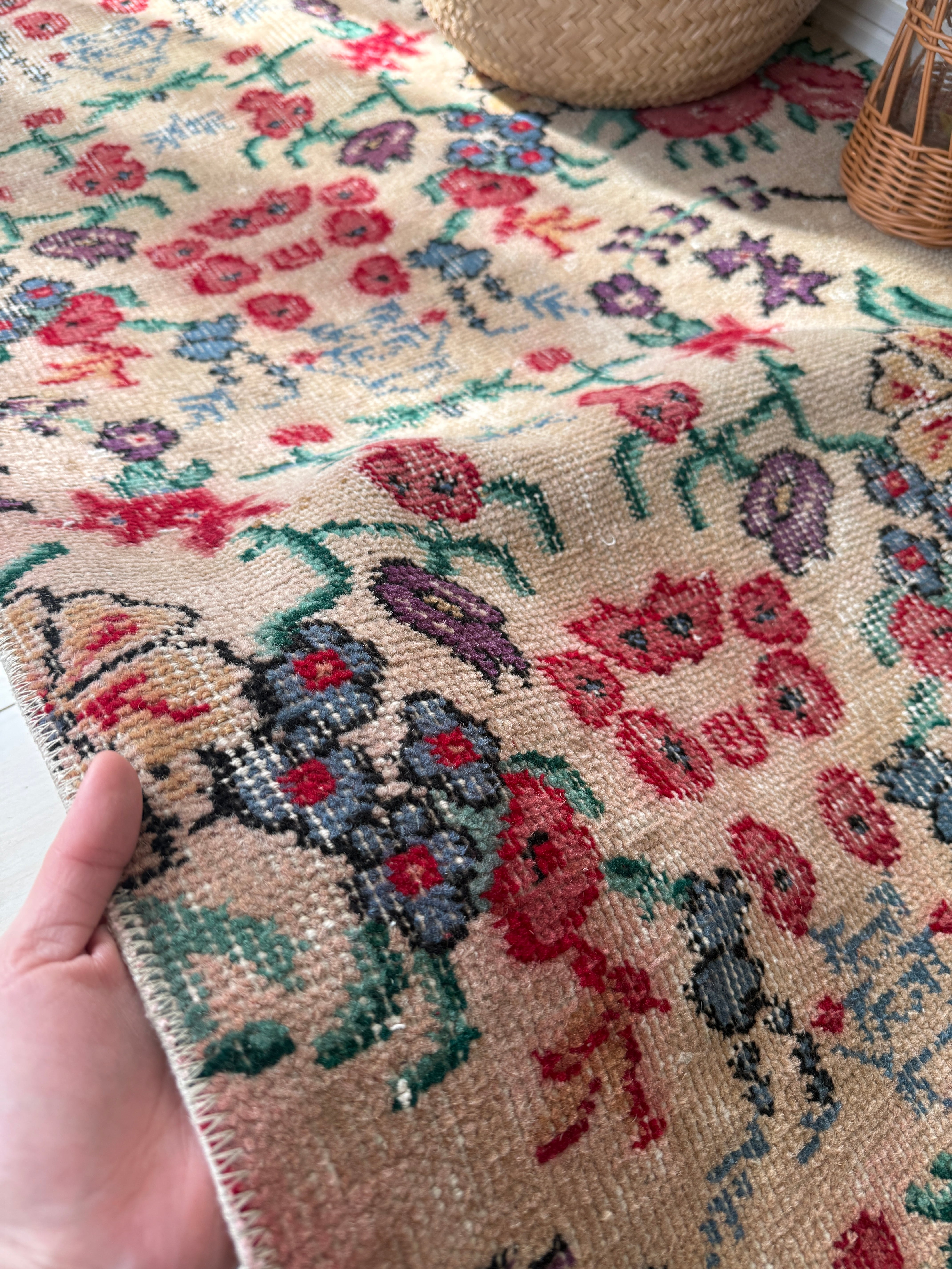 やさしいベージュのベースに小さなお花のブーケが並ぶように描かれた、可愛らしいヴィンテージラグ。