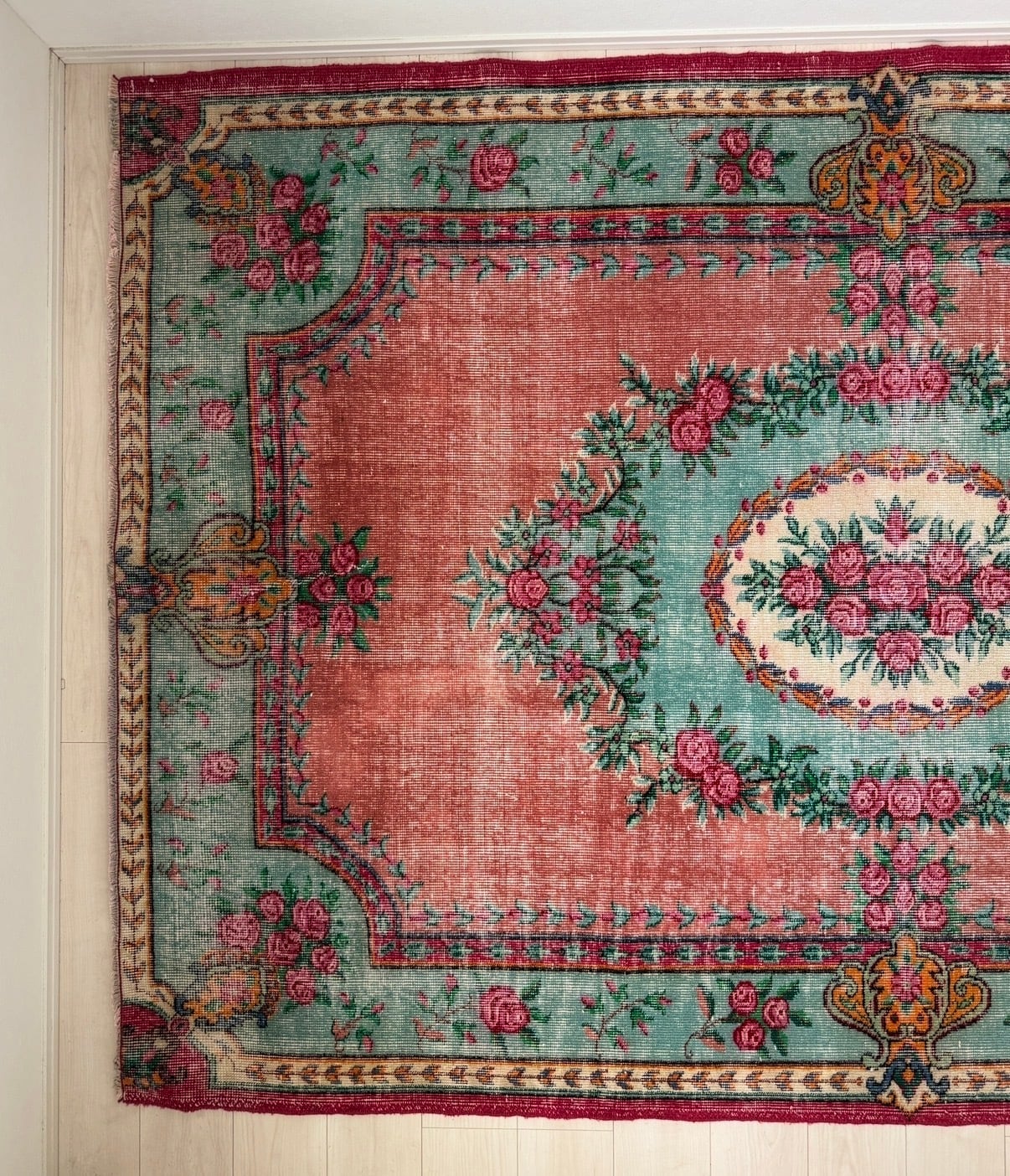 【約168cm×約253cm】70's vintage over size rug -"mint rose garden"-