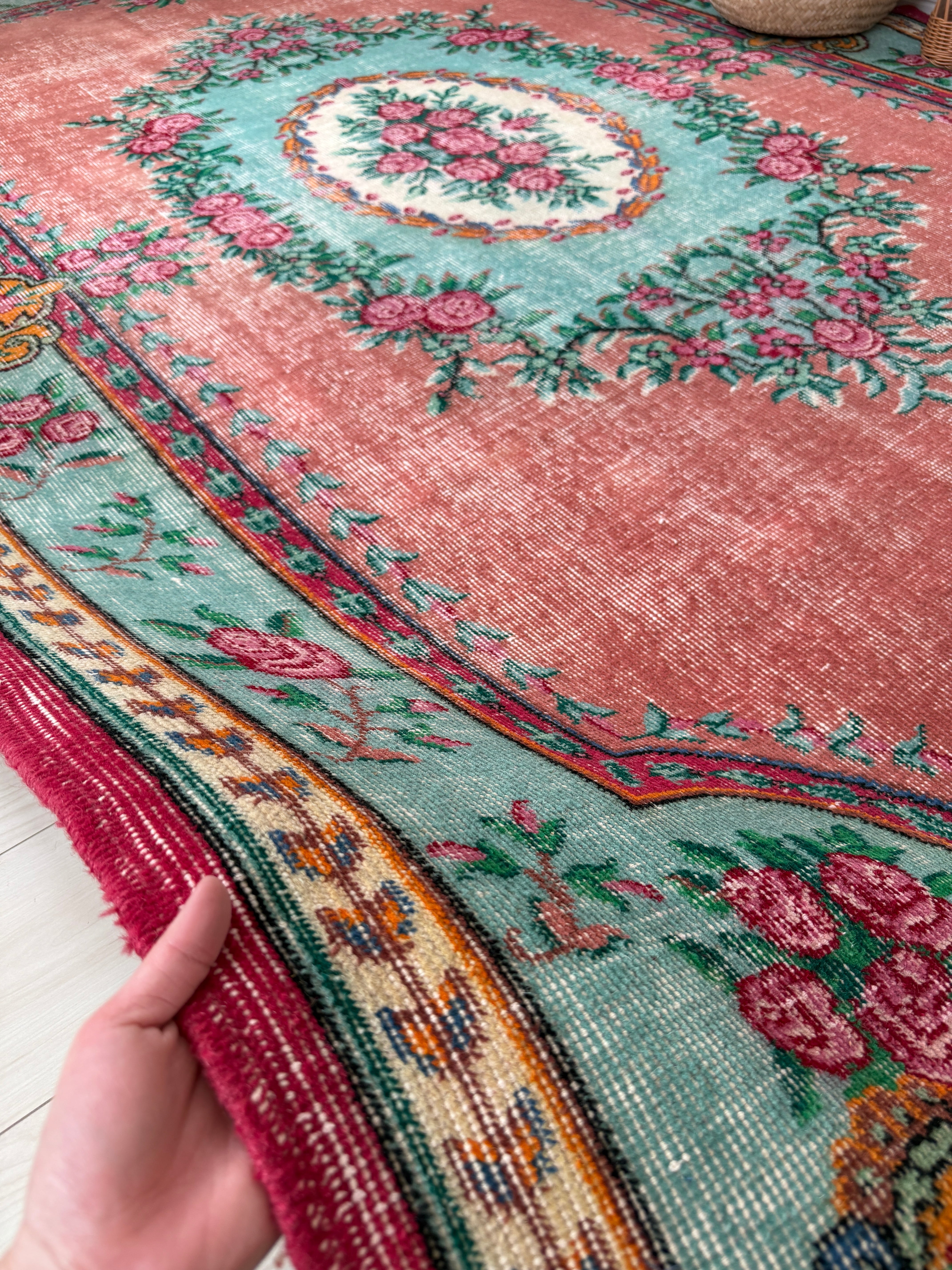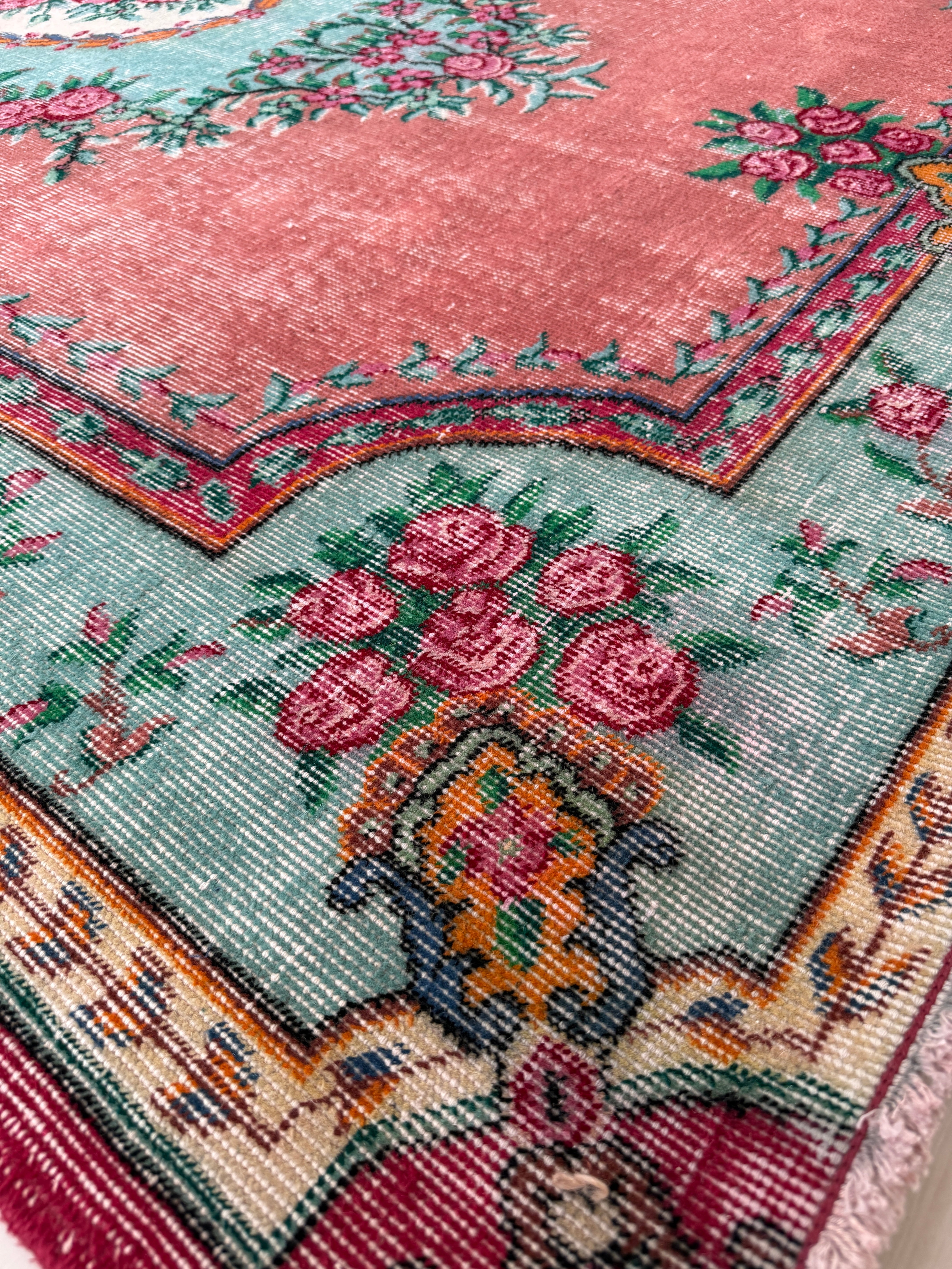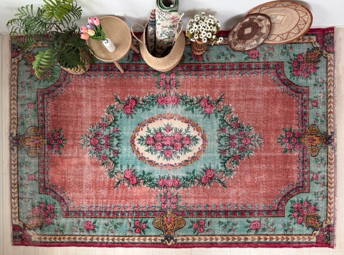 あたたかみのあるピンクをベースに、グリーンとお花のコントラストが美しく映えるデザインのヴィンテージラグ。