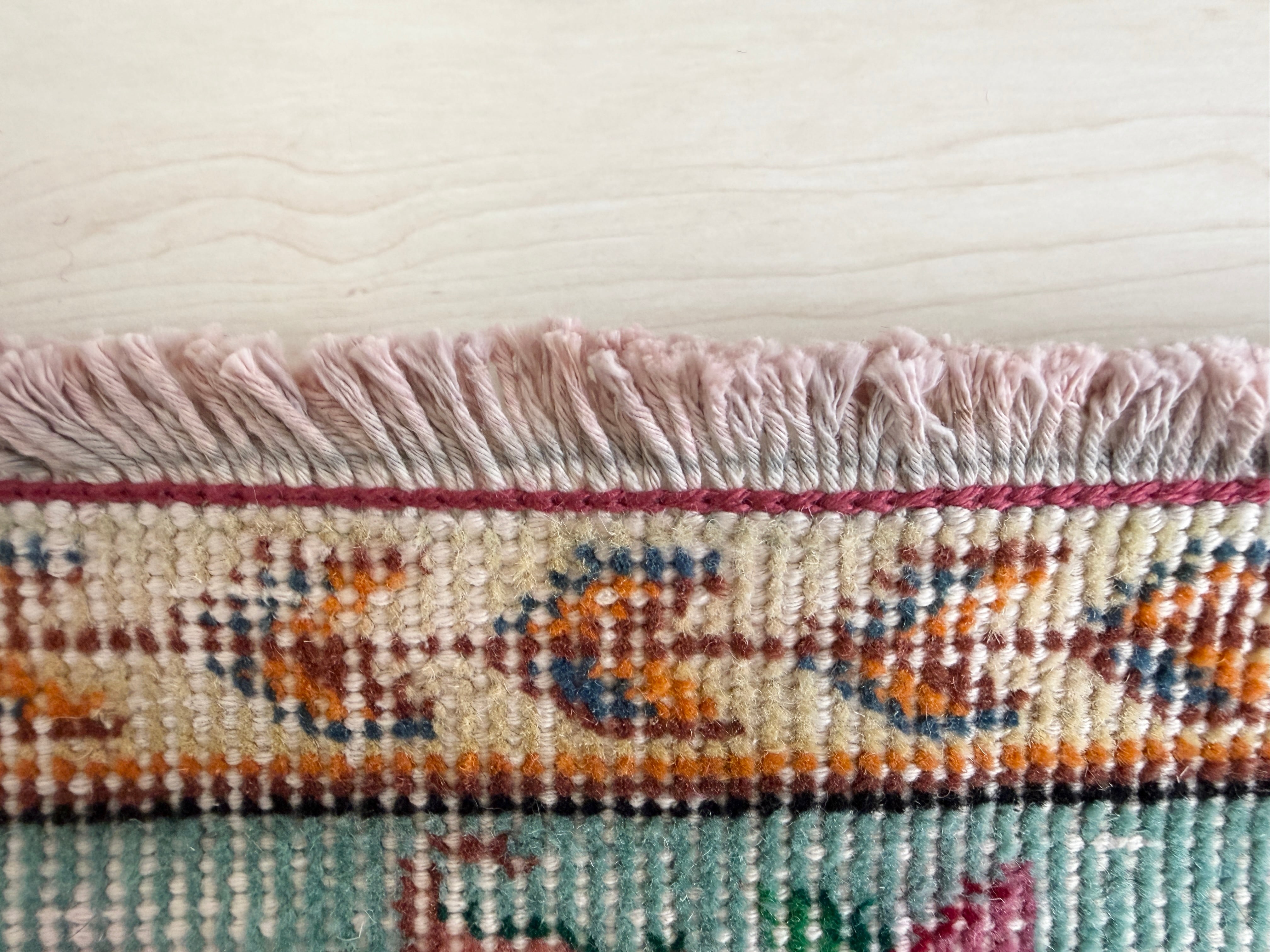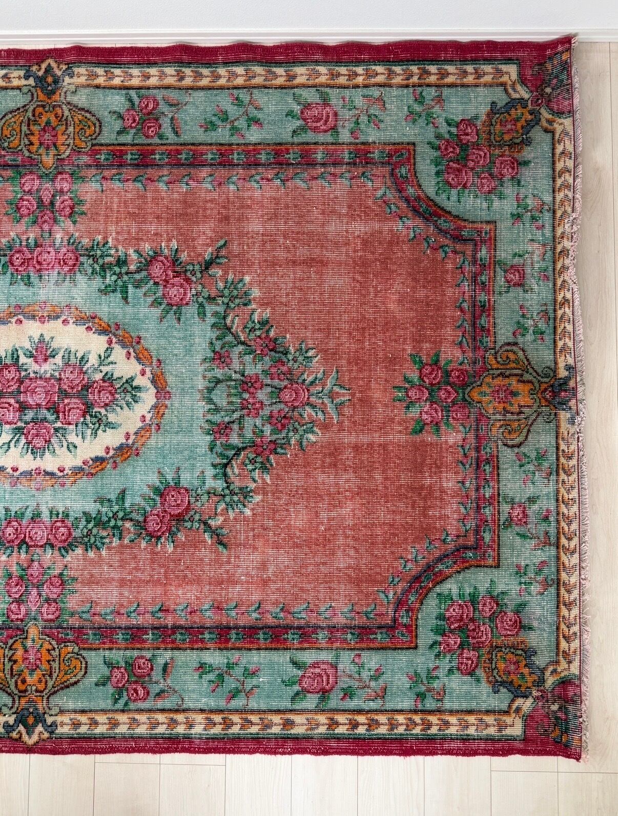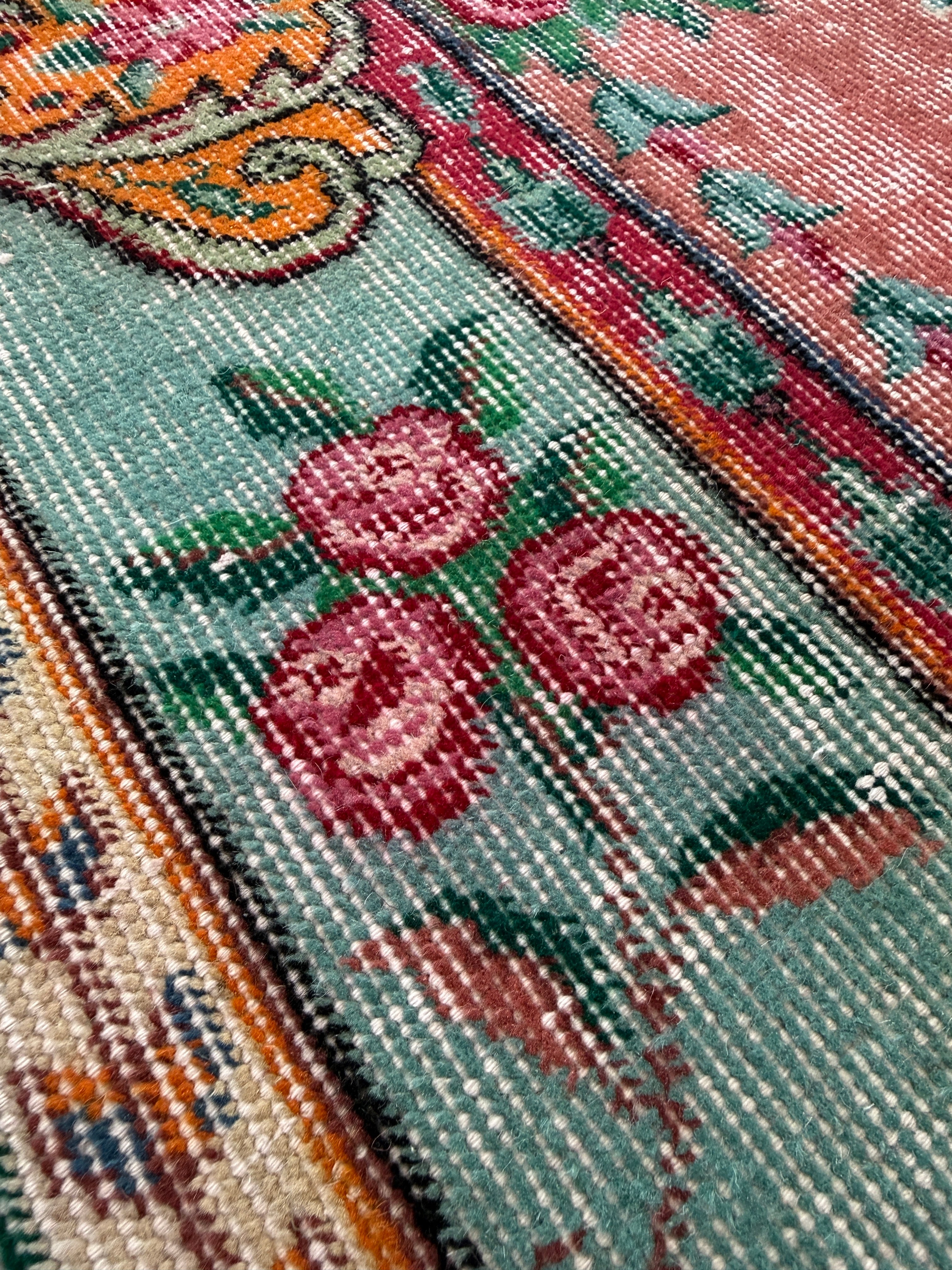 あたたかみのあるピンクをベースに、グリーンとお花のコントラストが美しく映えるデザインのヴィンテージラグ。