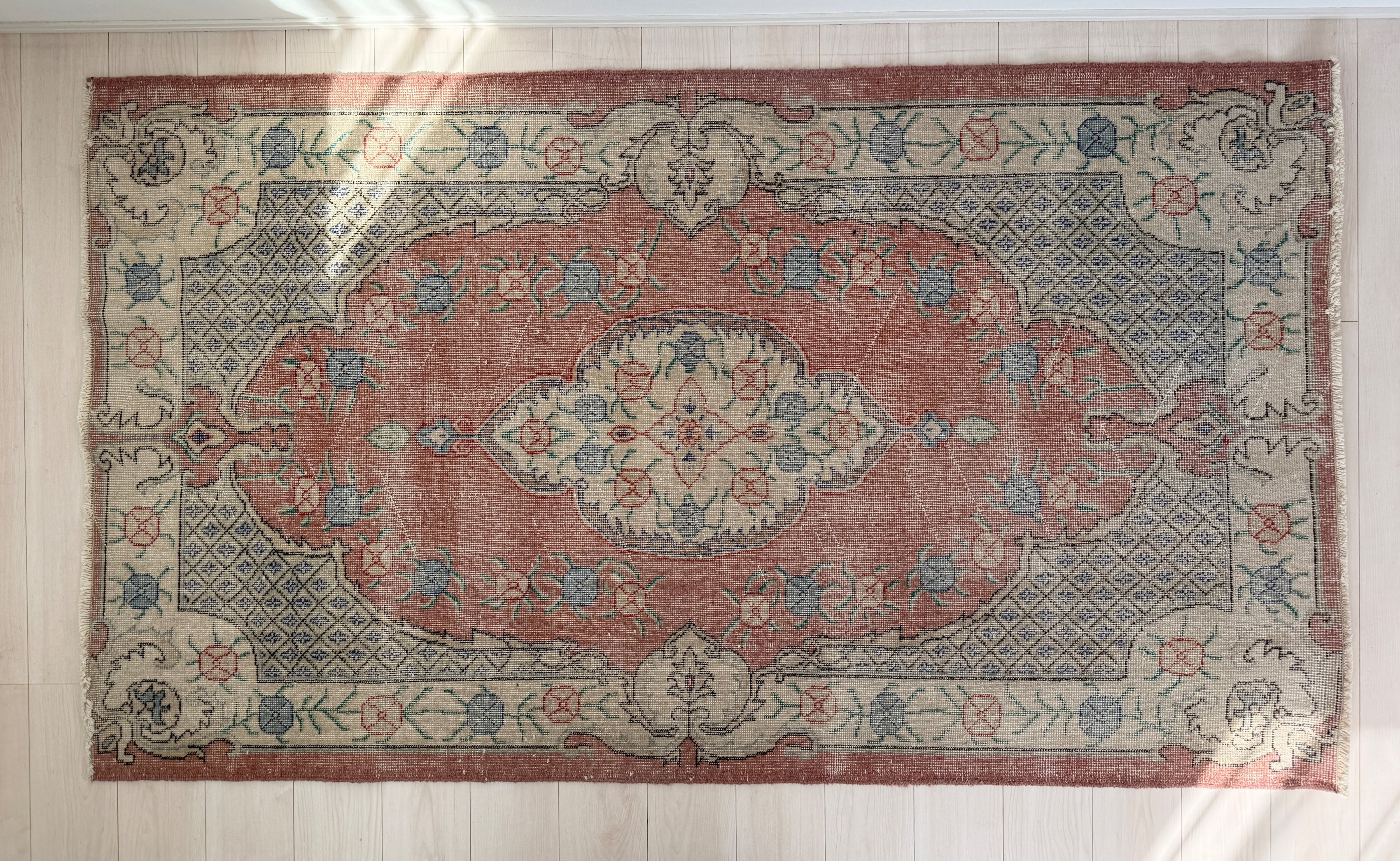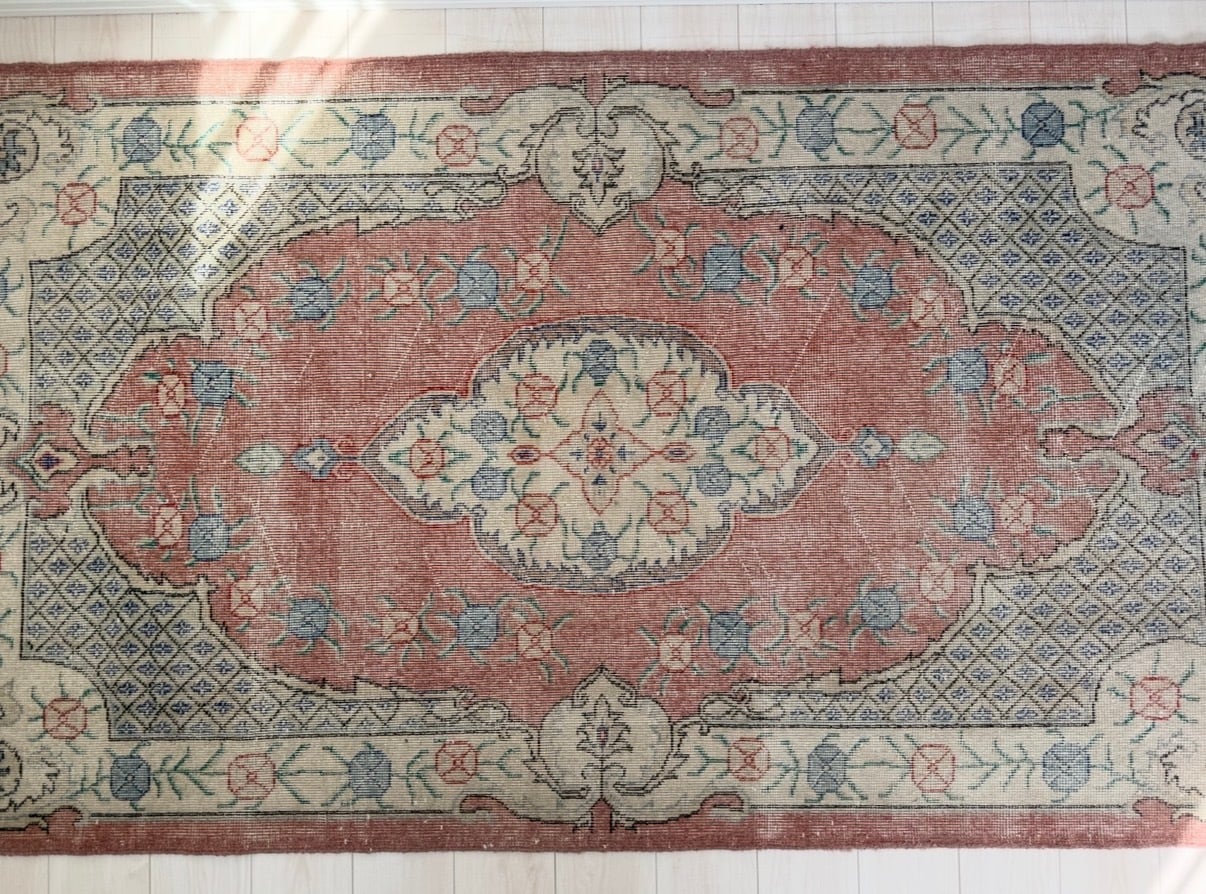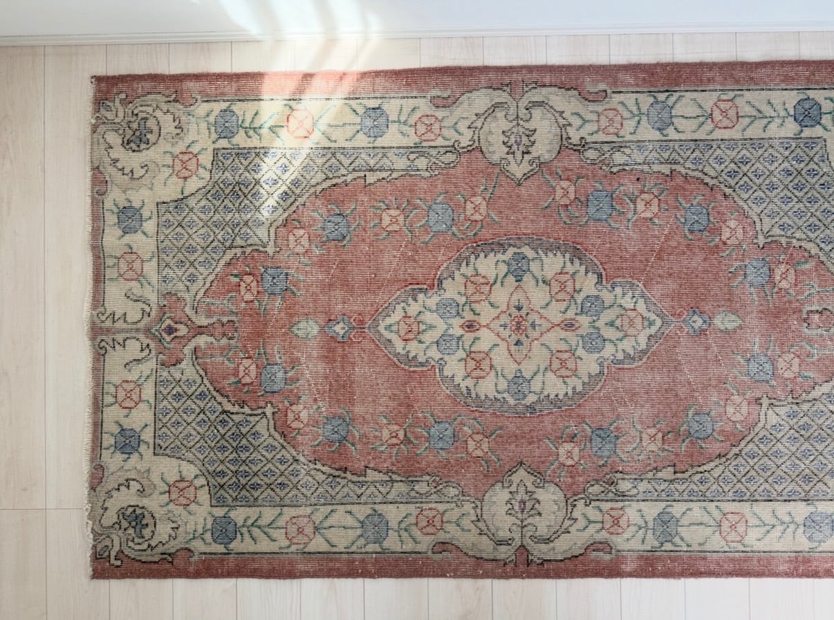 リビングに敷いてソファ前に合わせたり、ダイニングテーブルの下に敷いても、空間をやさしくまとめてくれそうなヴィンテージラグです。