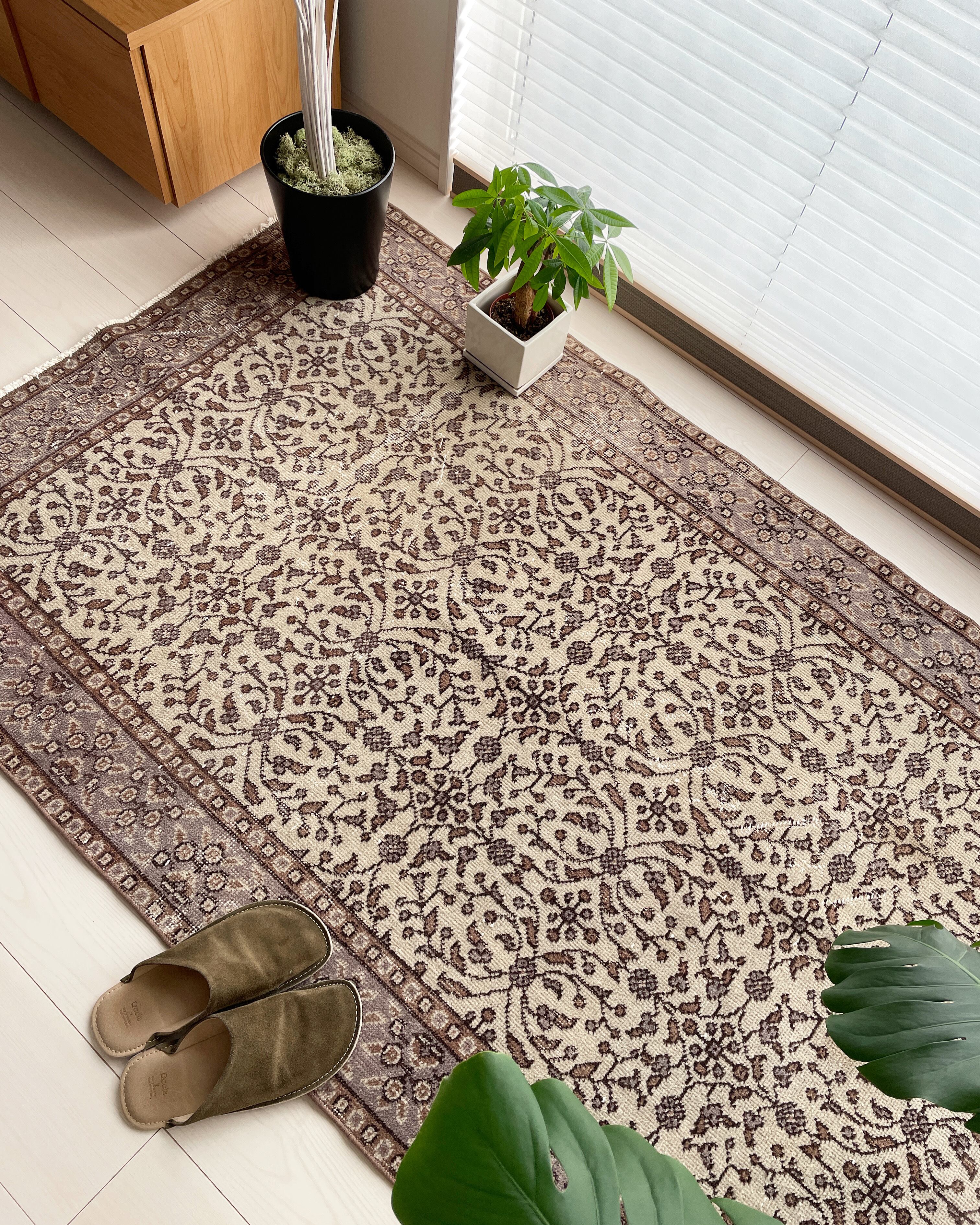 ヴィンテージラグは、糸のほつれ、抜け、毛羽立ち、シミなど見られる場合がございます。ヴィンテージ品ならではの雰囲気としてお楽しみいただけますと幸いです。