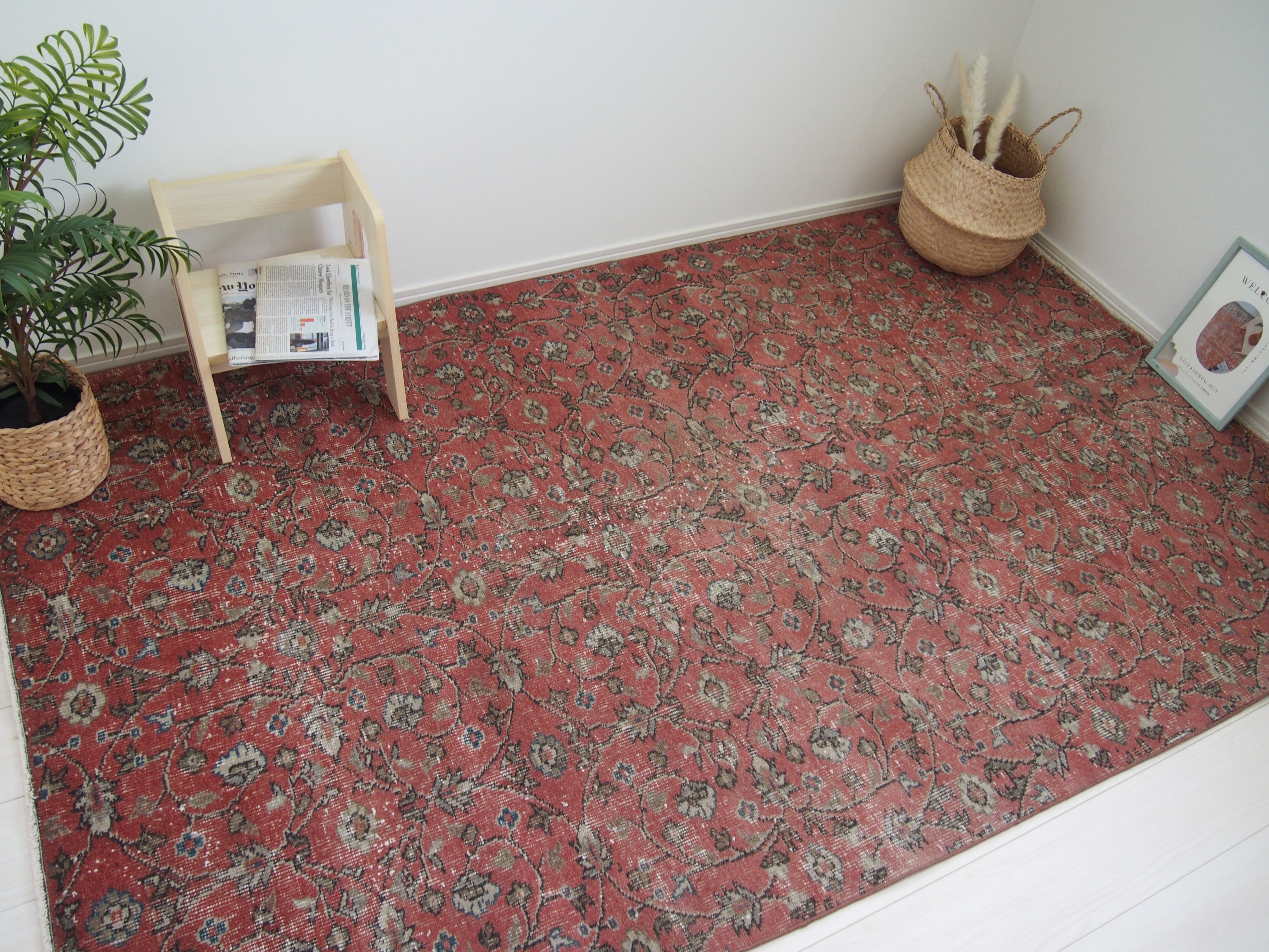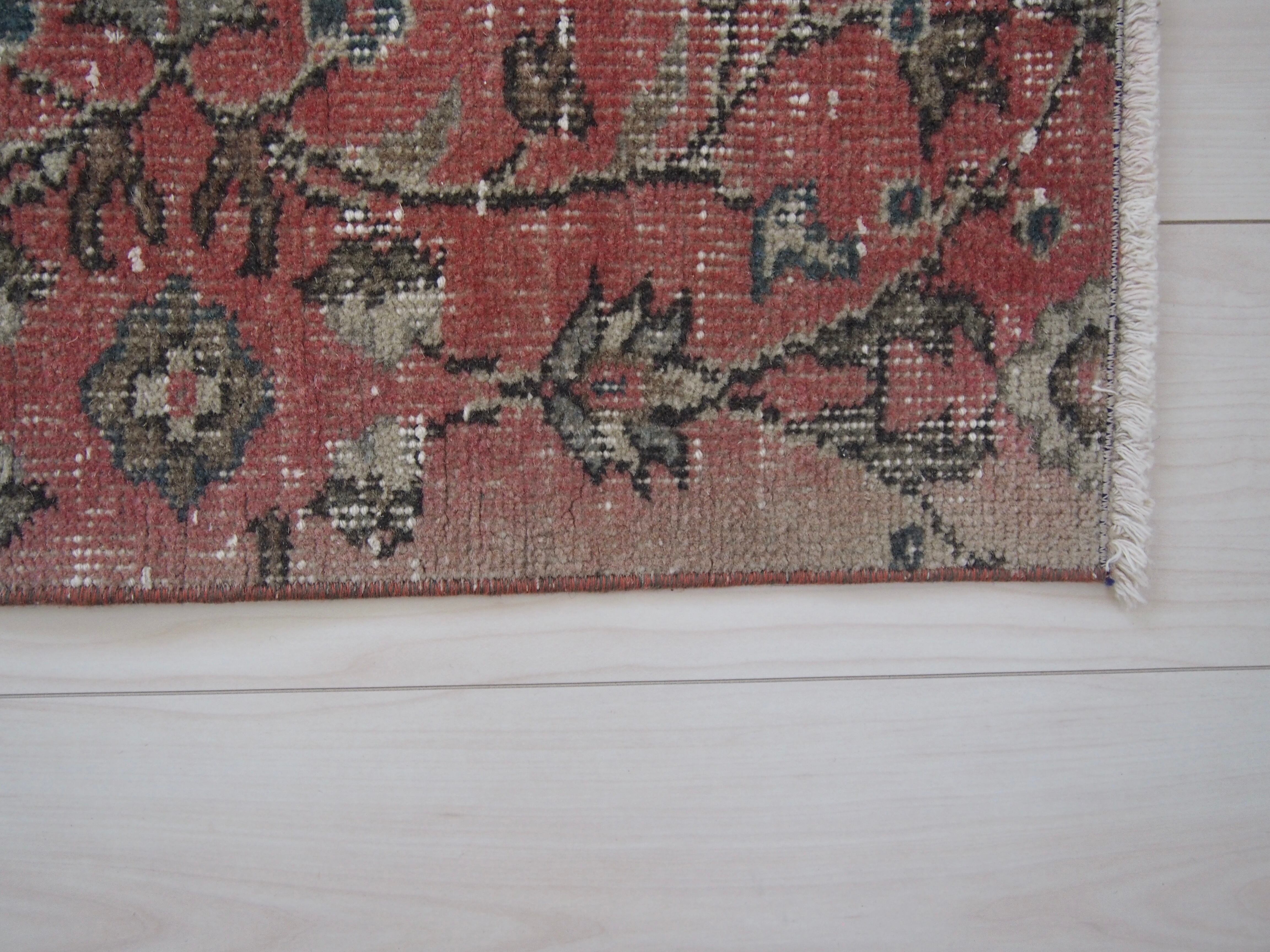 かわいらしい色味とヴィンテージらしい渋みが合わさった世界にひとつだけのラグです^^