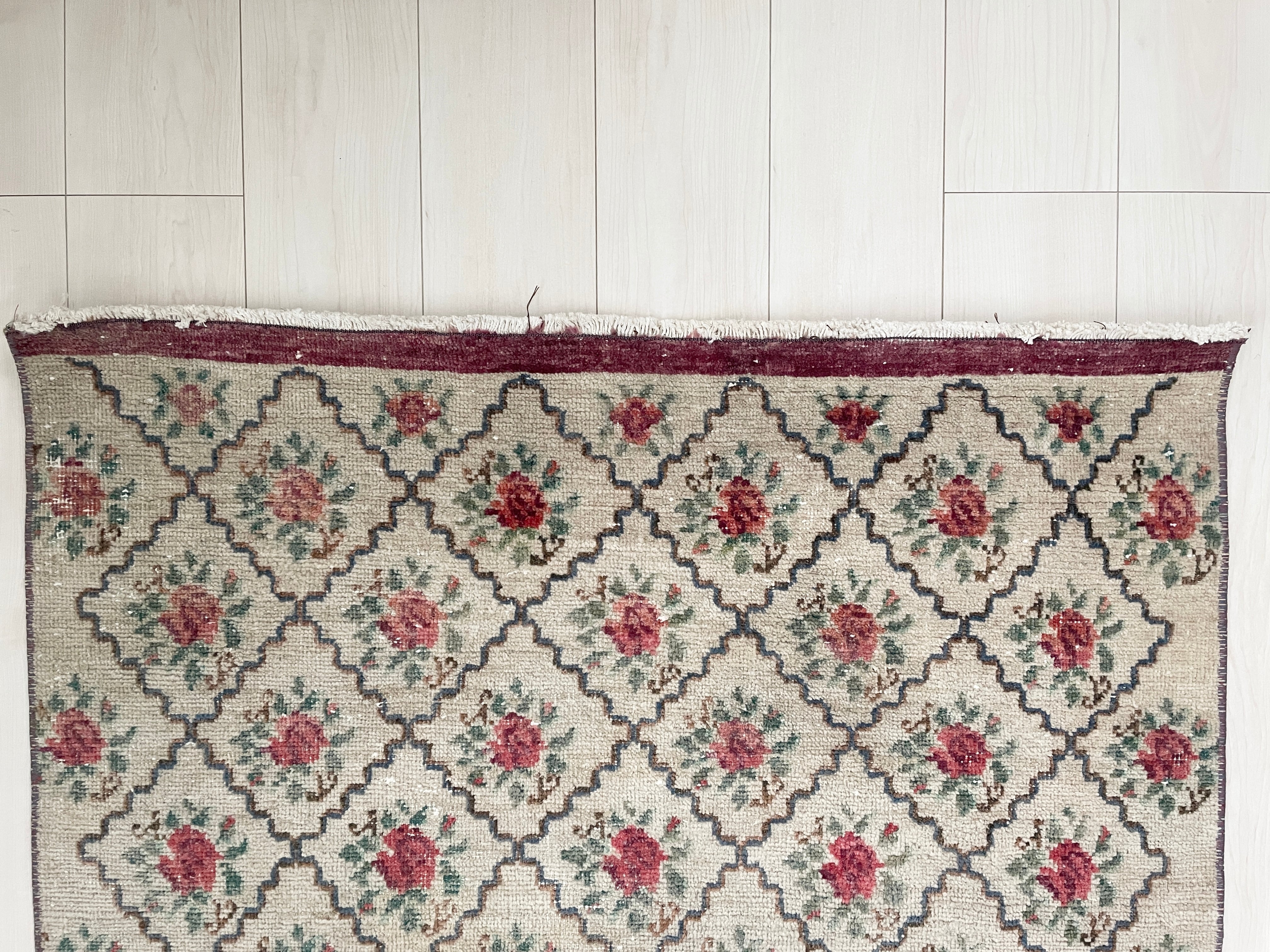 ケシの花が1輪1輪デザインされているヴィンテージラグ。