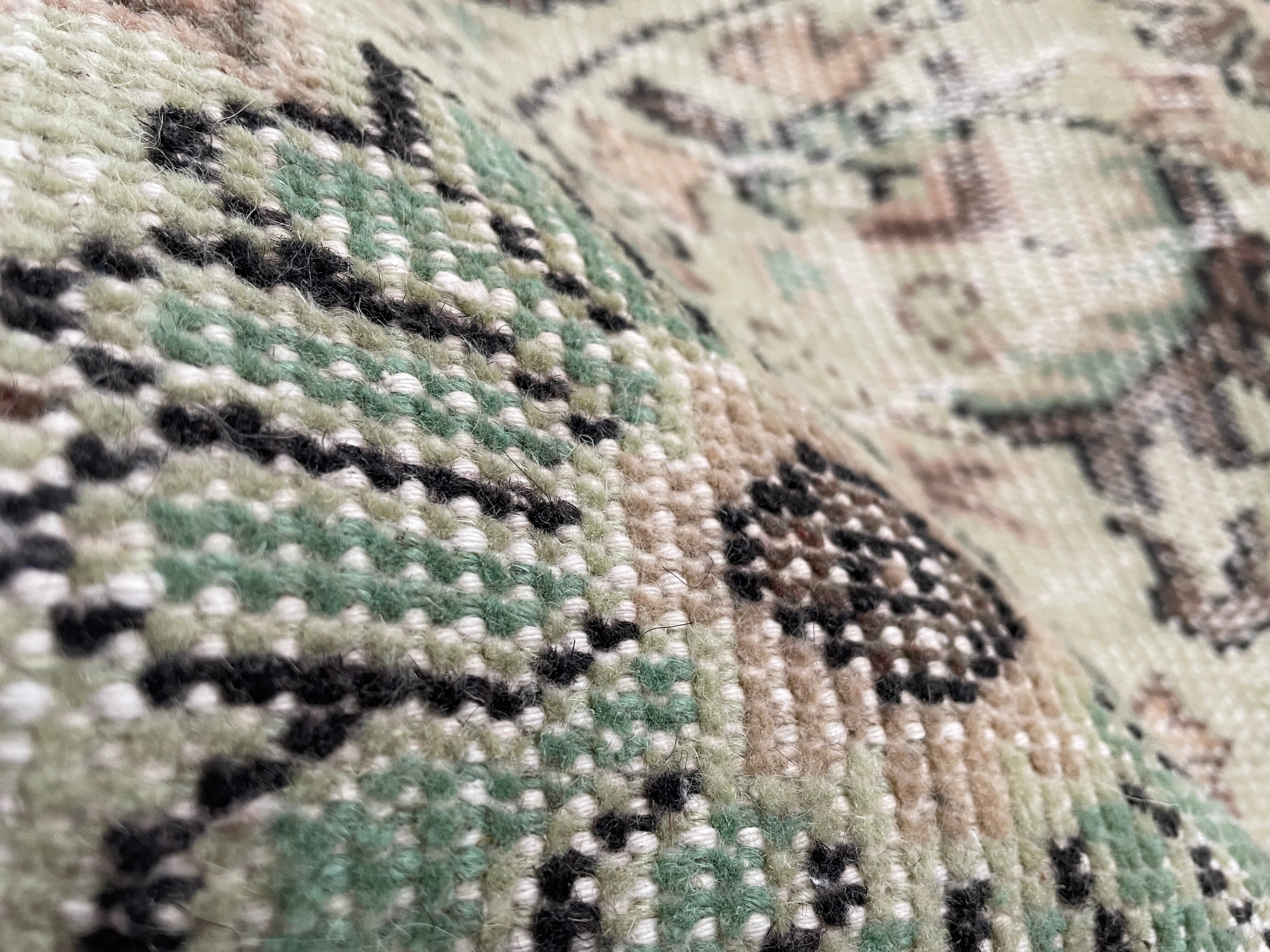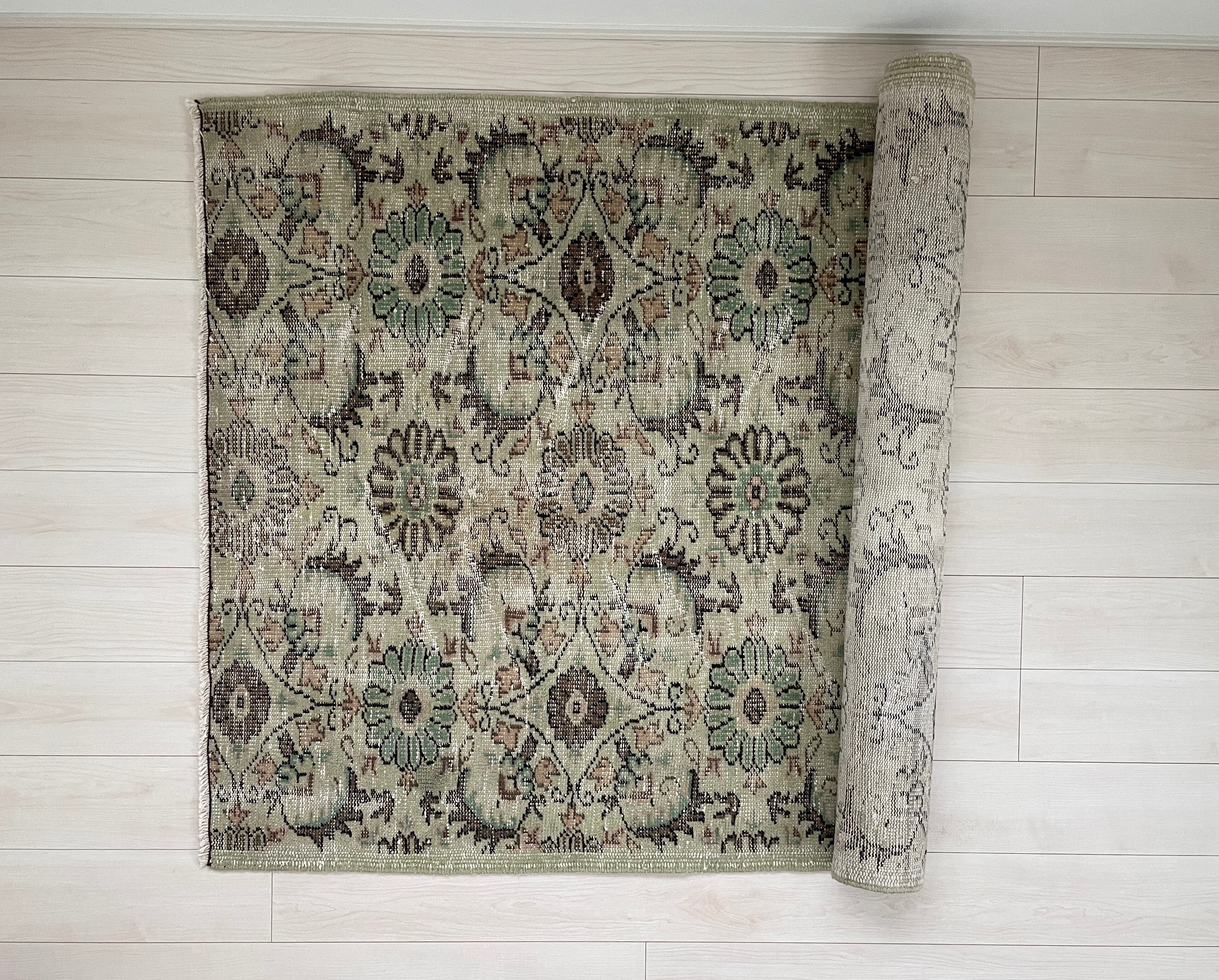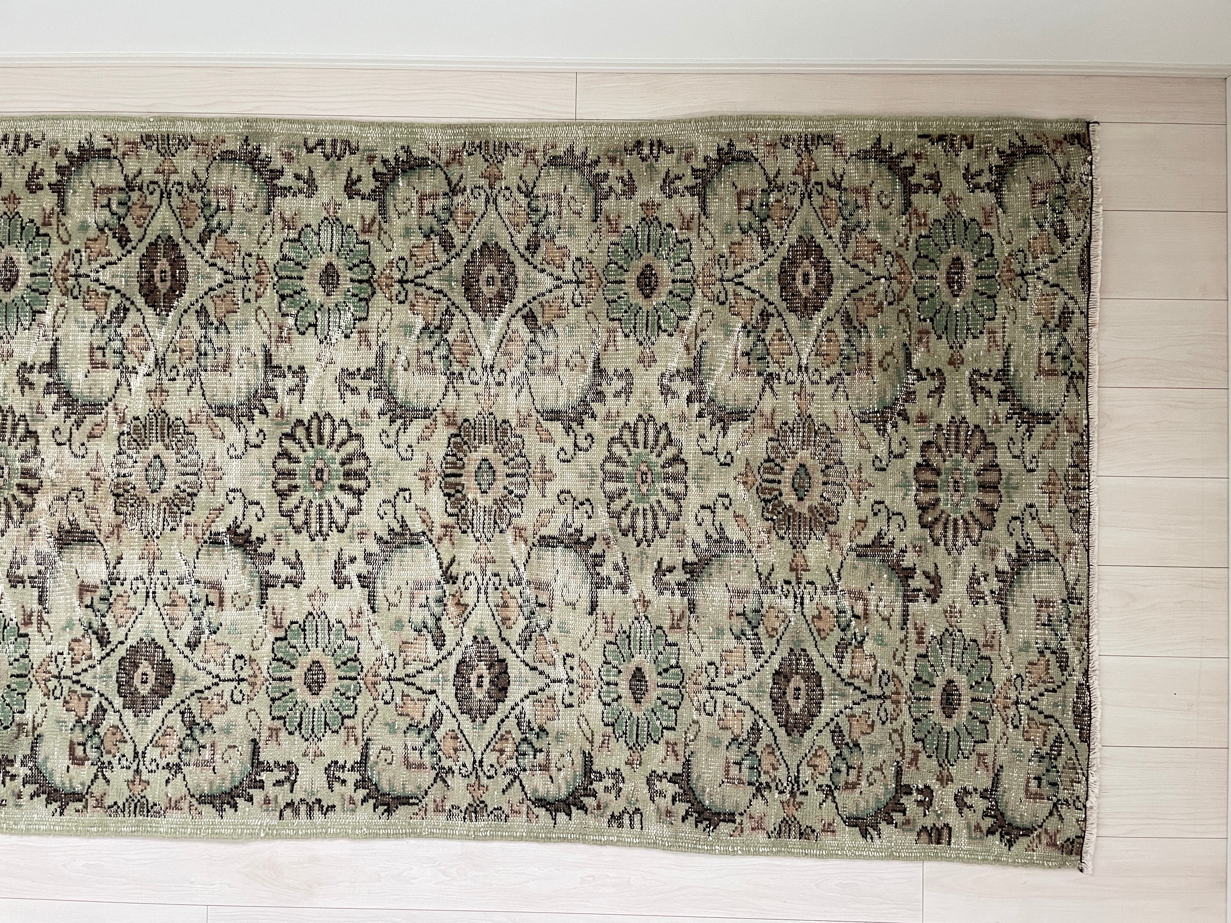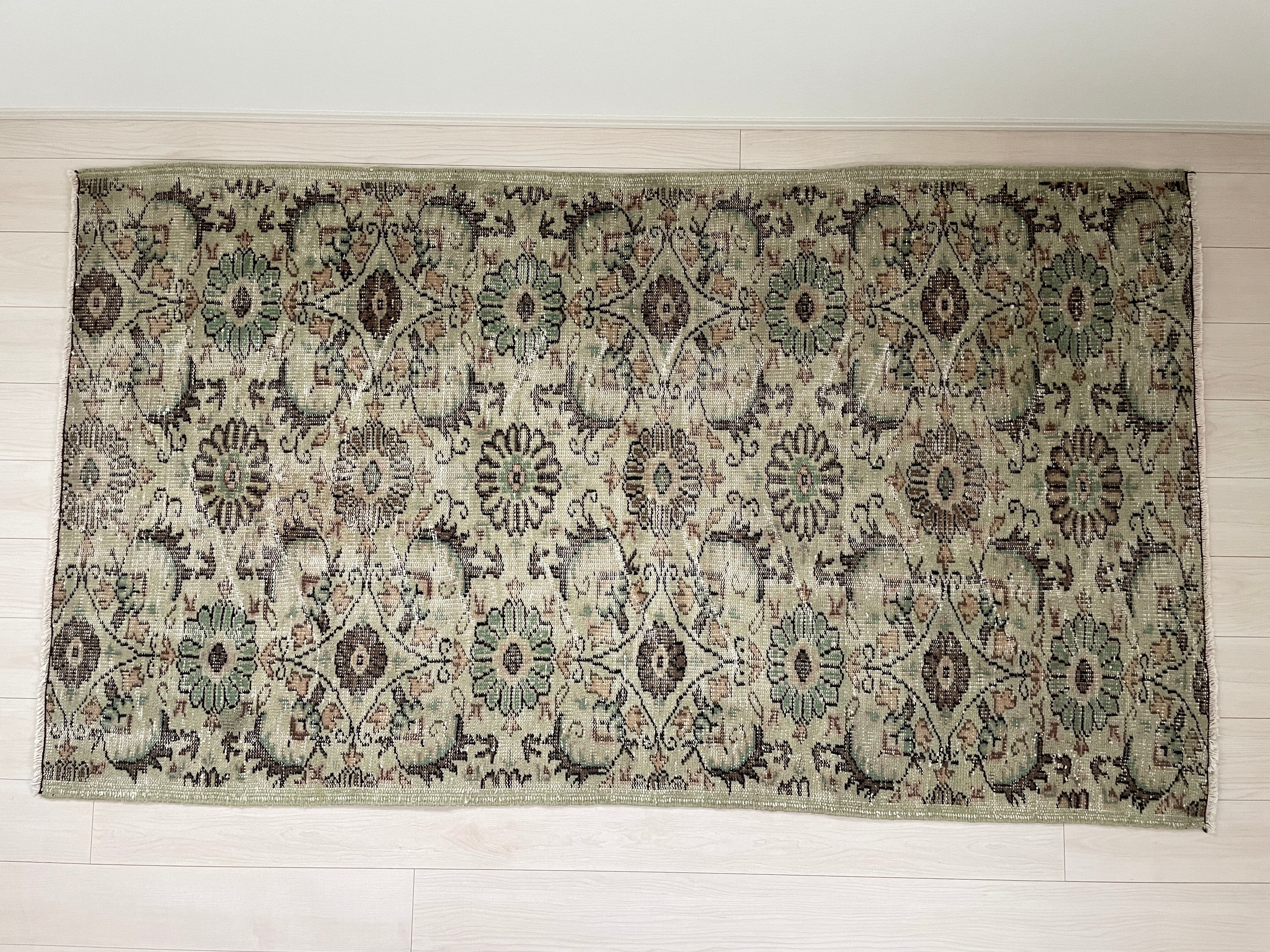 まるでピスタチオのような色合いにデイジーがデザインされた希少なヴィンテージラグ。