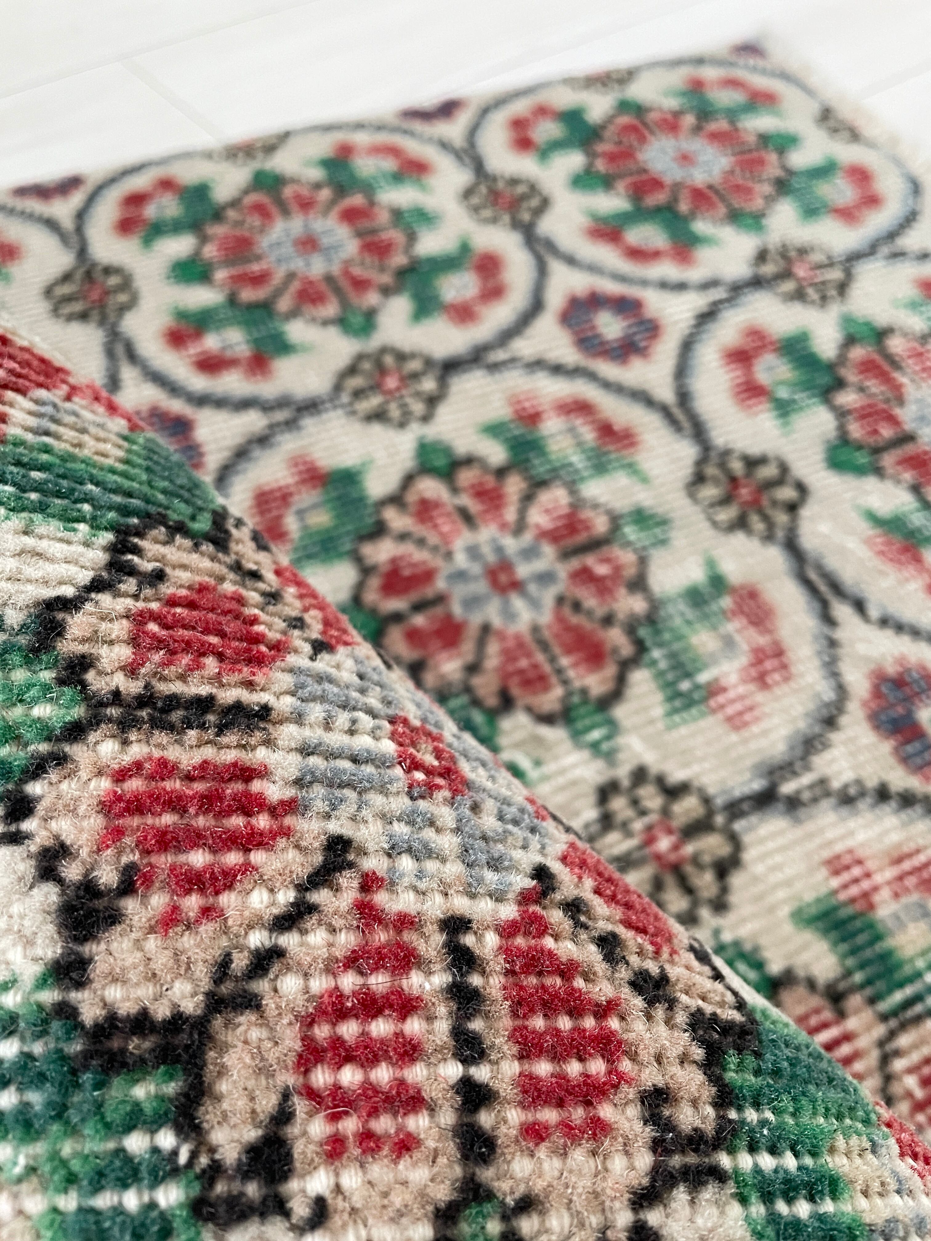 お部屋に存在感を放つ、とても華やかなヴィンテージのミニサイズラグ。