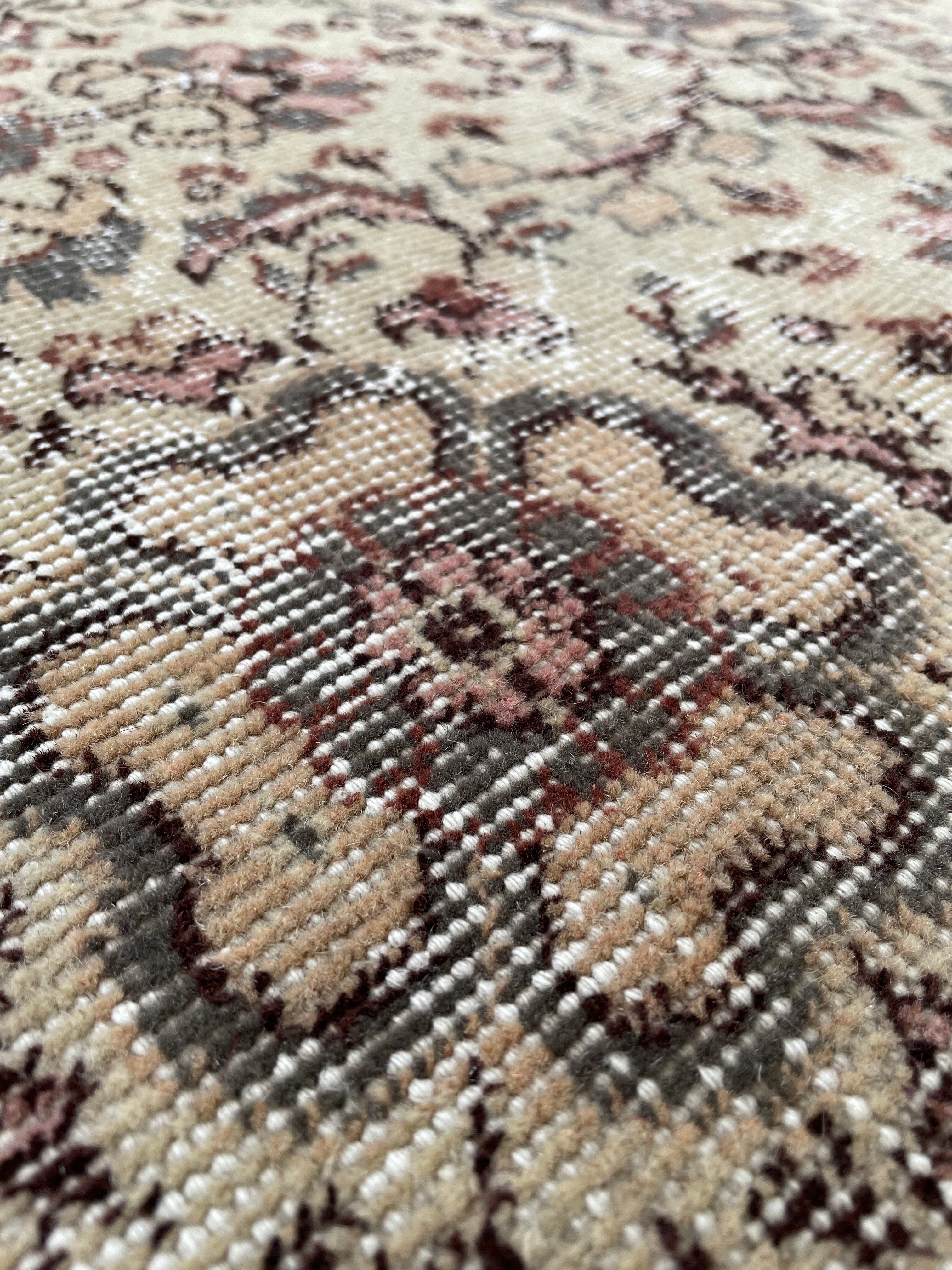バラやハイビスカス、四つ葉のクローバーがデザインされたエレガントな雰囲気を持つヴィンテージラグ。