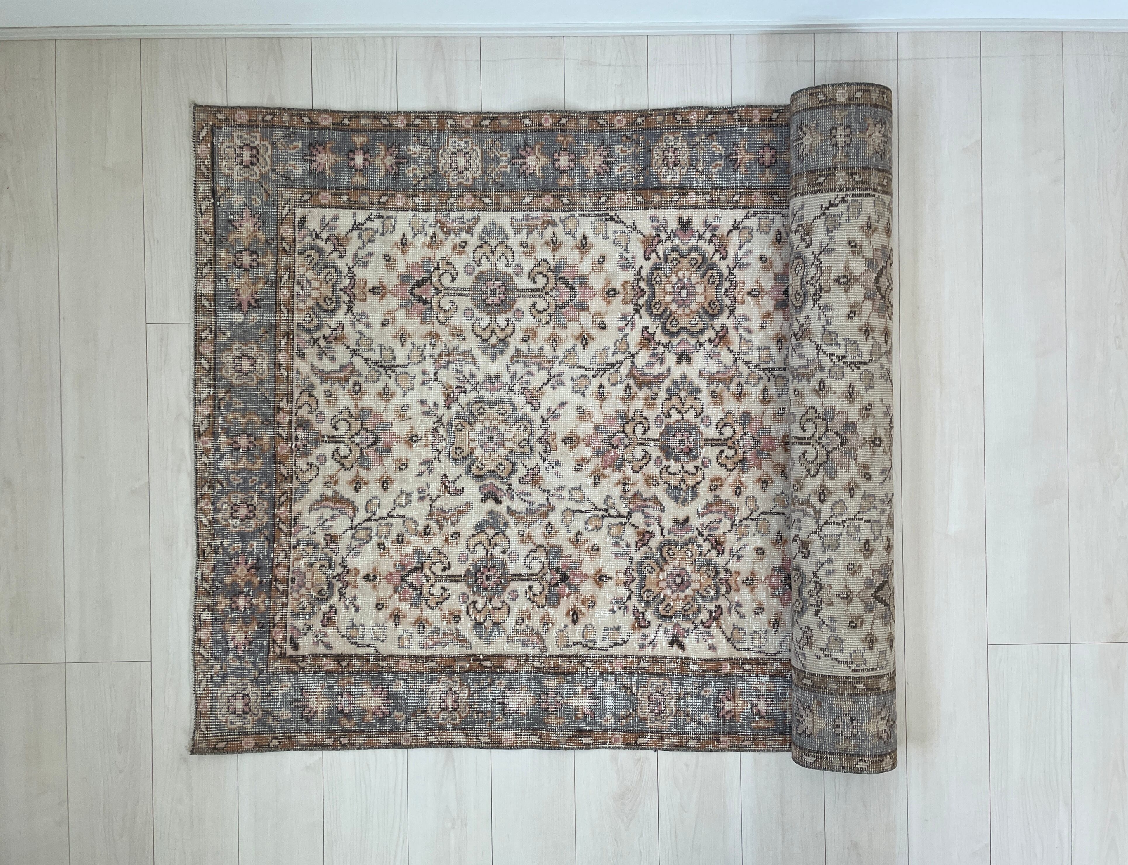 バラやハイビスカス、四つ葉のクローバーがデザインされたエレガントな雰囲気を持つヴィンテージラグ。