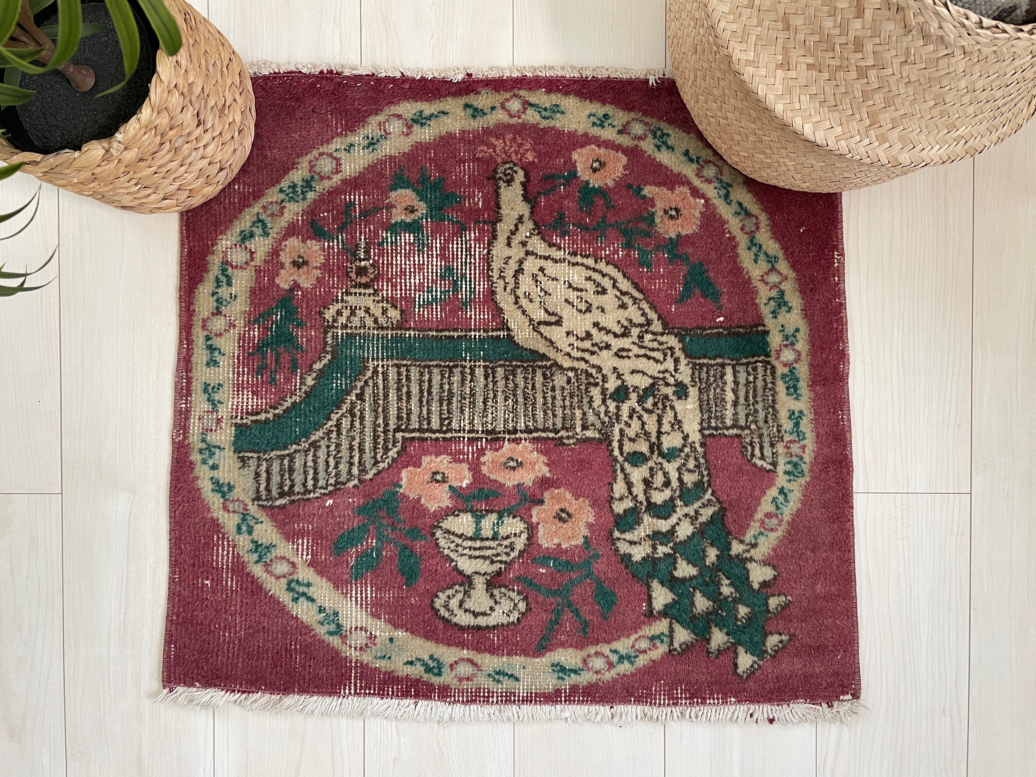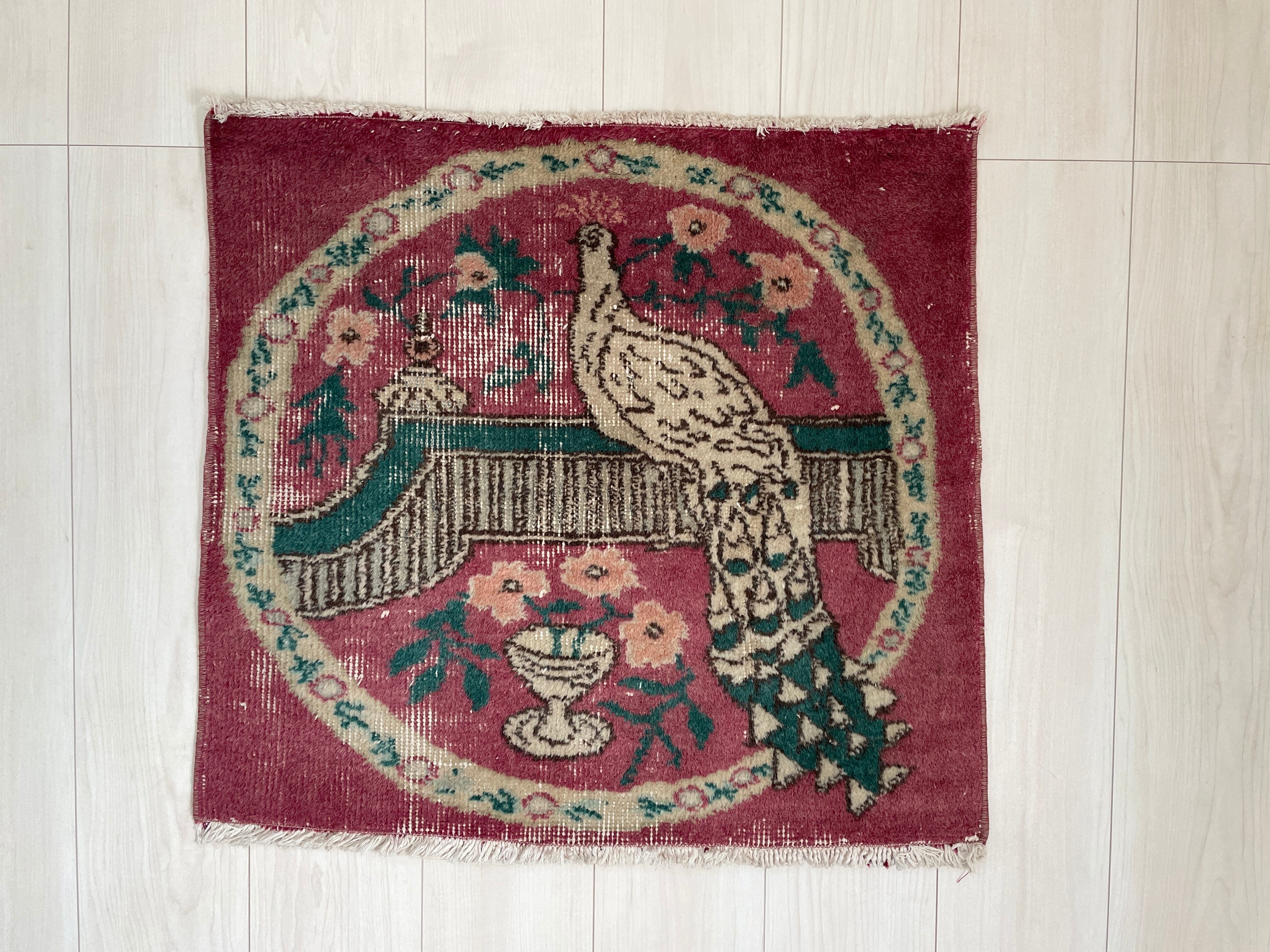 鳥とお花がデザインされた珍しいヴィンテージラグ。